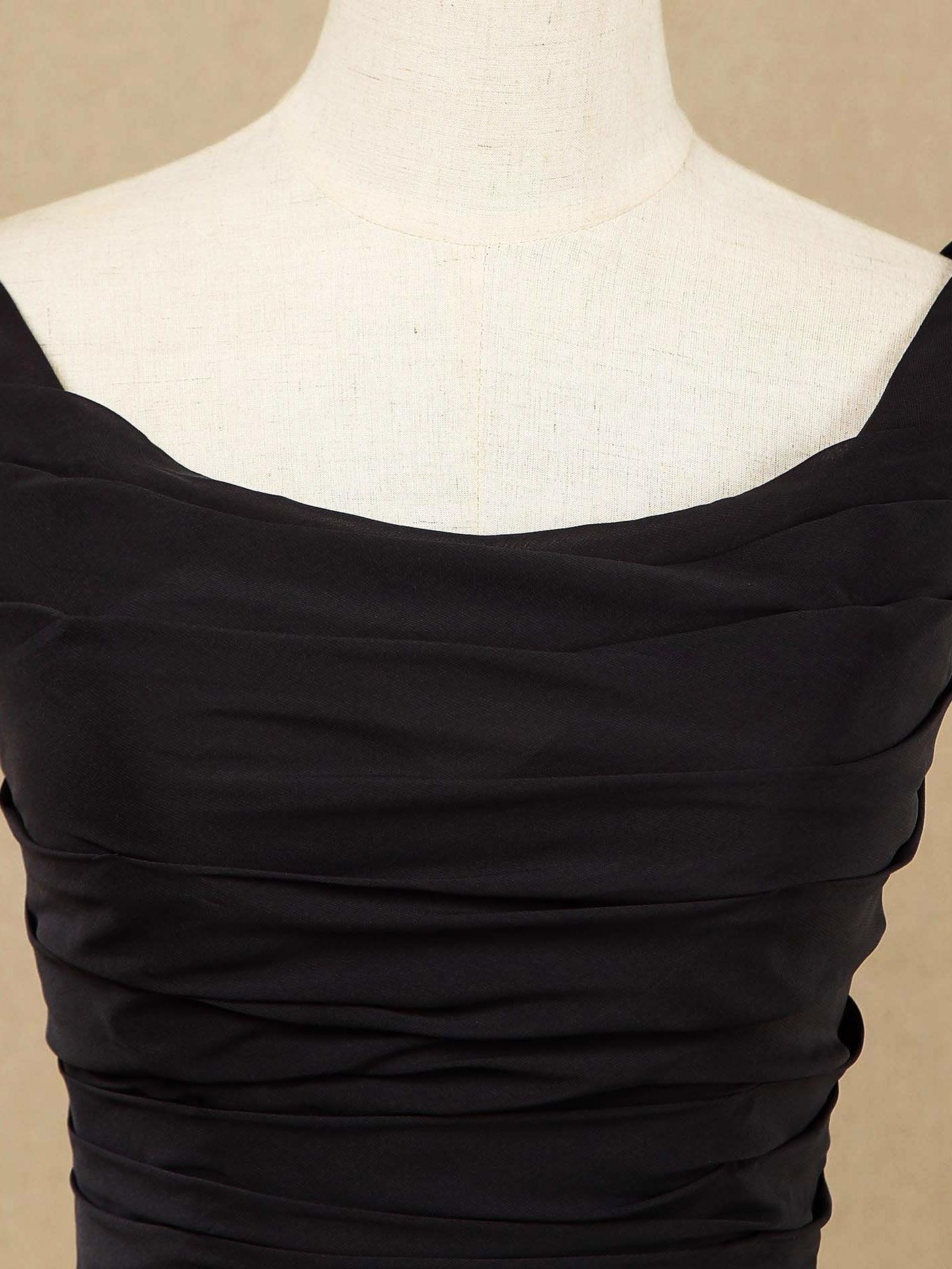 1. A-Linien-Brautjungfernkleid aus Chiffon mit U-Ausschnitt und bodenlangem Wasserfallausschnitt, mit gerüschten Falten, auf Bestellung gefertigt.