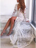 Strand Boho Brautkleider Meerjungfrau / Trompete V-Ausschnitt Langarm Sweep / Brush Train Spitze Brautkleider mit Applikationen Split Front Sommer Herbst Hochzeit Party