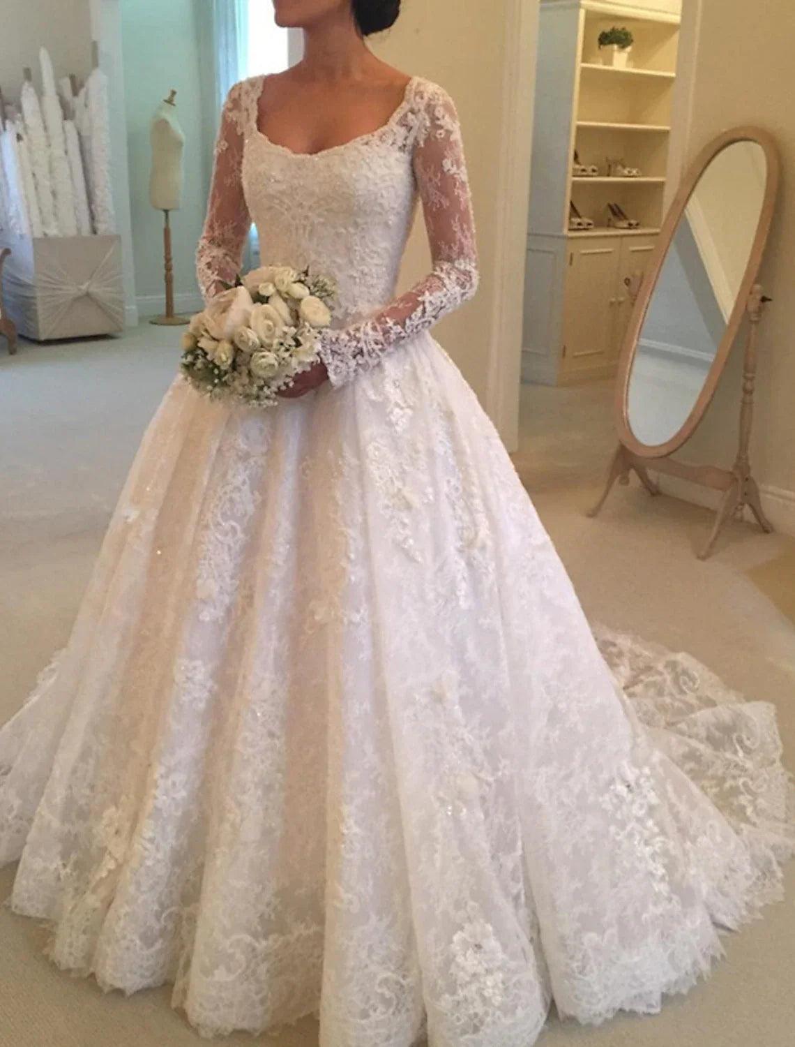 Verlobungs-Hochzeitskleider für den Herbst, Ballkleid, Illusionsausschnitt, lange Ärmel, Kapellenschleppe, Spitze, Brautkleider mit Knöpfen und Perlen