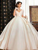 Verlobungs-Hochzeitskleider für den Herbst, Ballkleid, V-Ausschnitt, kurze Ärmel, Hofschleppe, Satin-Brautkleider mit gerüschter Volltonfarbe