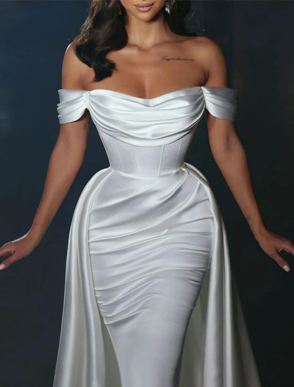 Verlobungs-Hochzeitskleider, formelles Brautkleid, Etui-Linie, schulterfrei, Flügelärmel, Kapellenschleppe, Satin-Brautkleid mit Rüschen, einfarbig, Sommer, Herbst, Hochzeitsfeier