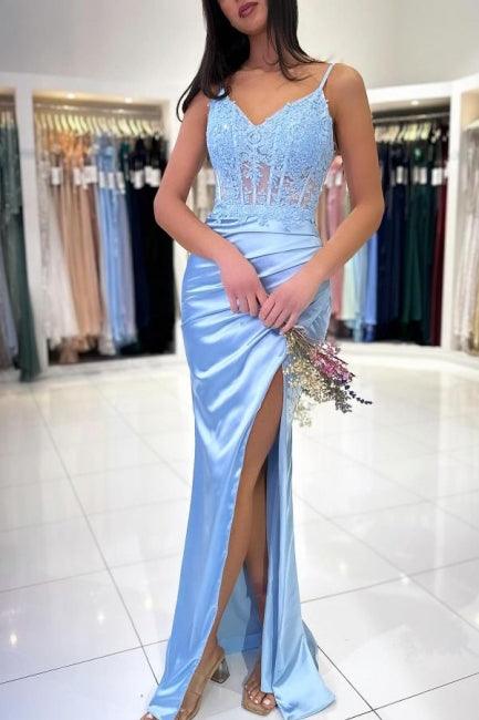 Erleben Sie Eleganz und Stil in unserem modischen, langen, himmelblauen Meerjungfrauen-Ballkleid. Die Meerjungfrauen-Silhouette betont Ihre Kurven, während die Spaghettiträger und Spitzendetails einen Hauch Weiblichkeit verleihen. Zeigen Sie mit dem Schlitz etwas Haut. Perfekt, um die ganze Nacht durchzutanzen. Seien Sie die Ballkönigin in diesem atemberaubenden Kleid.