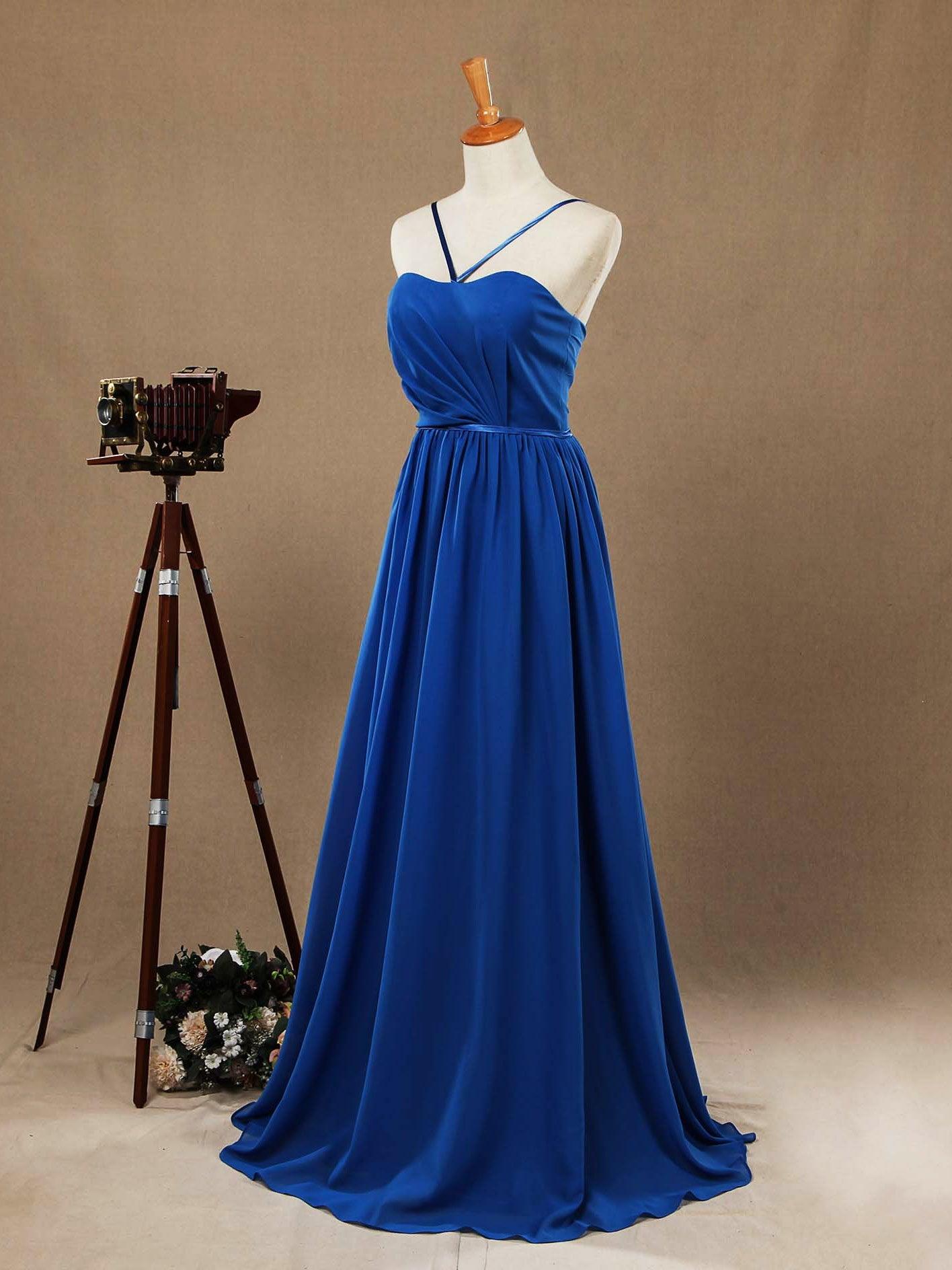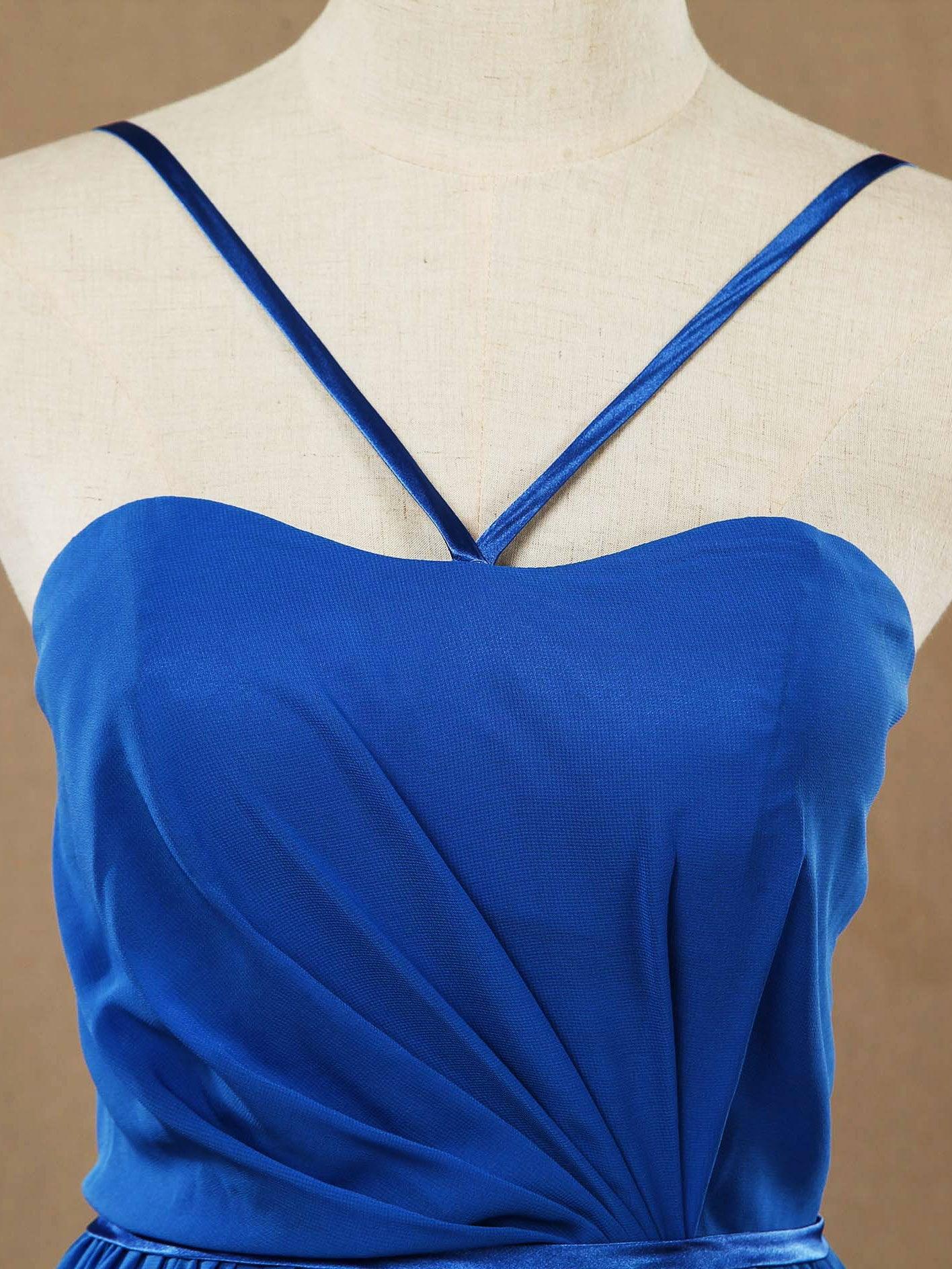 Bodenlanges A-Linien-Brautjungfernkleid aus Chiffon mit Spaghettiträgern und Rüschenfalten, auf Bestellung gefertigt.