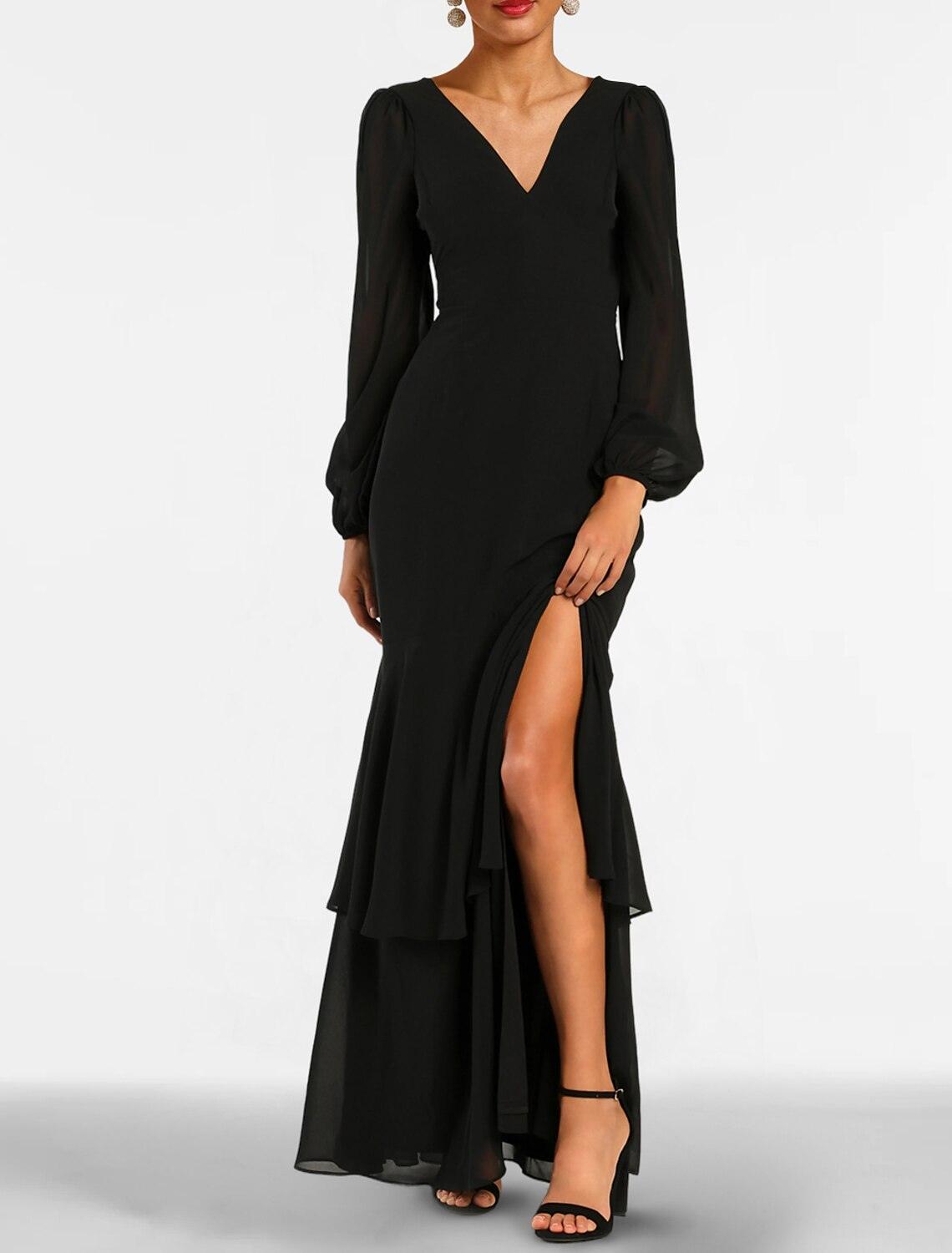Meerjungfrau Schwarzes Abendkleid Stufenplissee Kleid Formal Hochzeitsgast Bodenlang Langarm V-Ausschnitt Gothic Chiffon mit Schlitz Riemchen