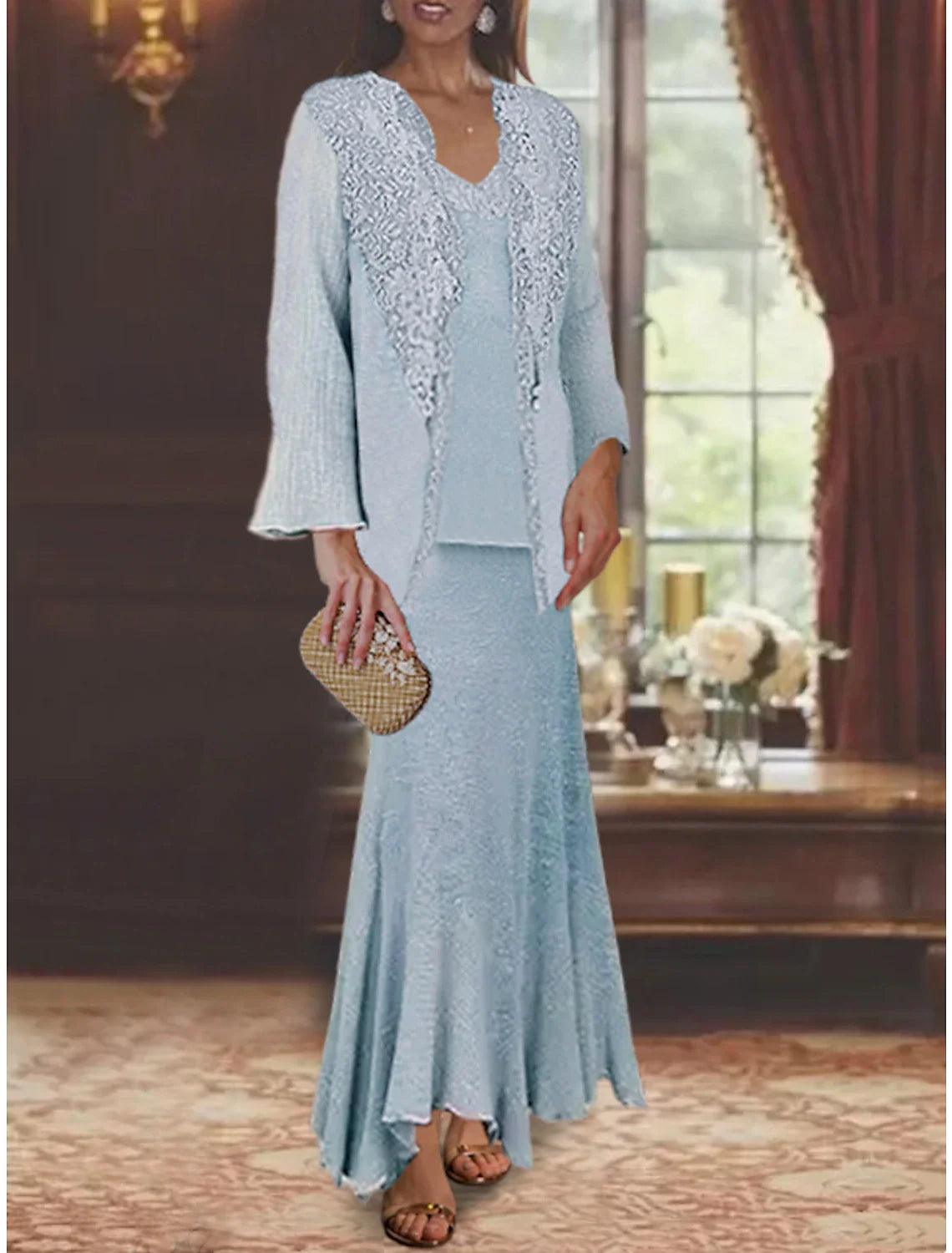 Meerjungfrau/Trompete, dreiteiliges Kleid für die Mutter der Braut, formeller Hochzeitsgast, eleganter V-Ausschnitt, asymmetrisch, knöchellang, Leinen-/Baumwollmischung, ärmellos, Wickelkleid inklusive Applikationen