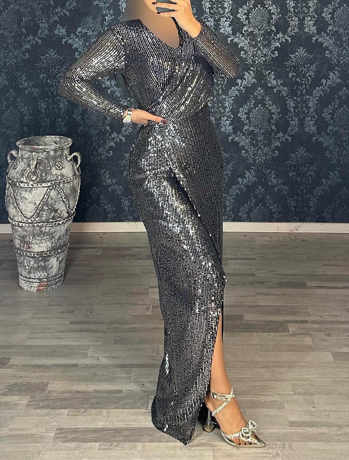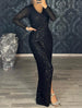 Meerjungfrau/Trompete Abendkleid Schwarzes Kleid Kleid Hochzeitsgast Herbst Bodenlang Langarm V-Ausschnitt Pailletten mit Pailletten