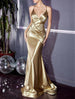 Meerjungfrau/Trompete Abendkleid Elegantes Kleid Verlobung Formeller Abend Sweep/Pinsel Schleppe Ärmellos Spaghettiträger Satin mit Kreuz Rüschen