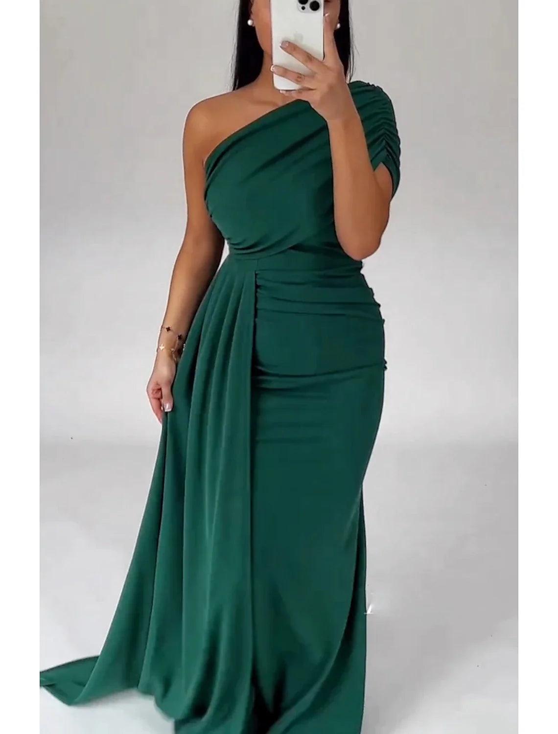 Meerjungfrau/Trompete Abendkleid Elegantes Kleid Formelles Weihnachten Rot Grün Kleid Sweep/Pinselzug Kurzarm Eine Schulter Satin mit Falten Gerafft