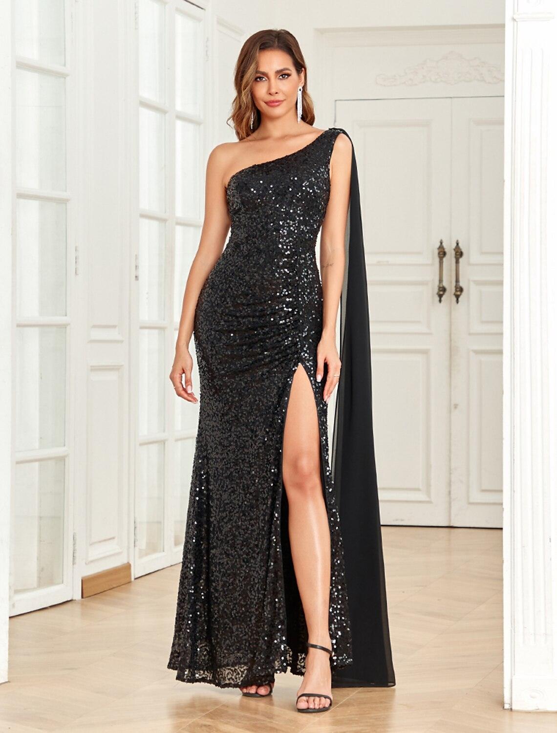 Meerjungfrau/Trompete Abendkleid Elegantes Kleid Abschlussball Hochzeit Empfang Bodenlang Ärmellos Schulterfrei Pailletten mit Paillettenschlitz
