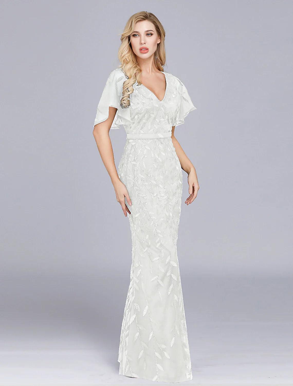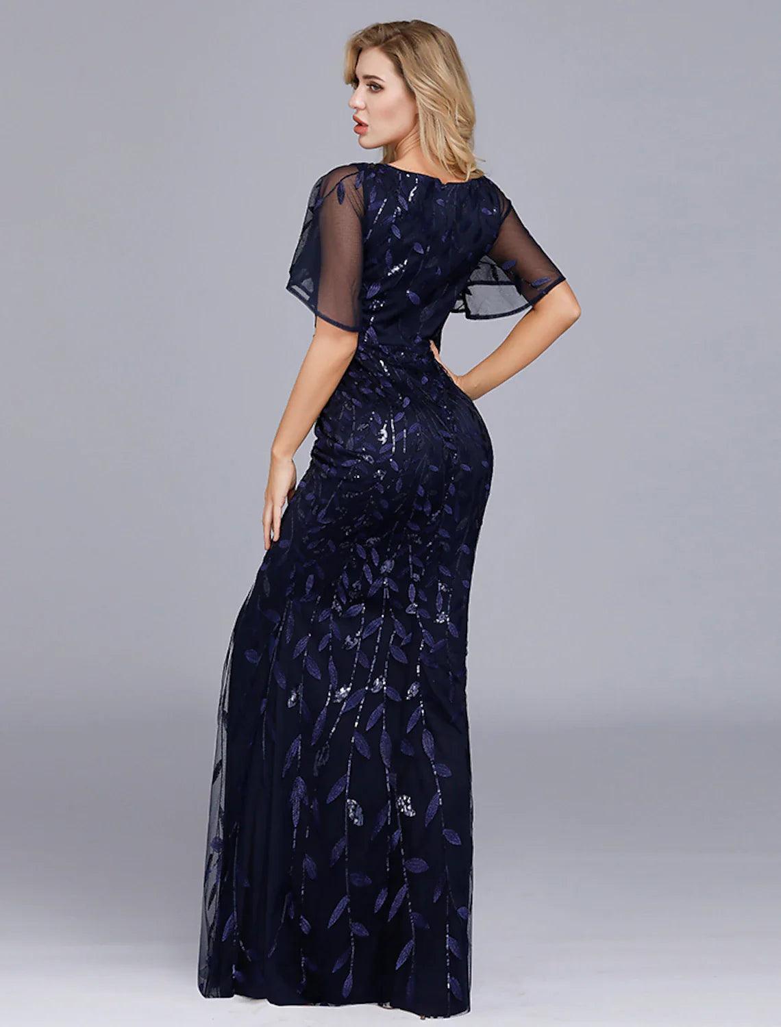 Meerjungfrau/Trompete Abendkleid Empire Kleid Partykleidung Formeller Abend Bodenlang Kurzarm Rundhalsausschnitt Tüll mit Rüschen Stickerei