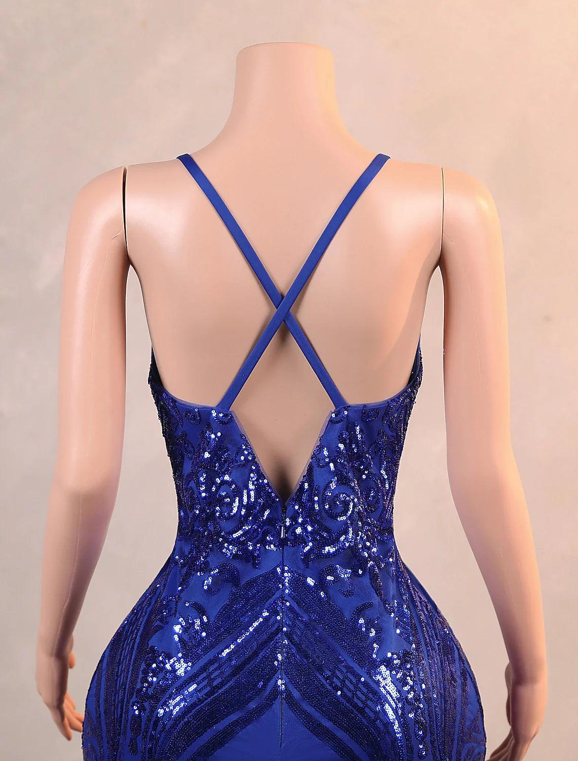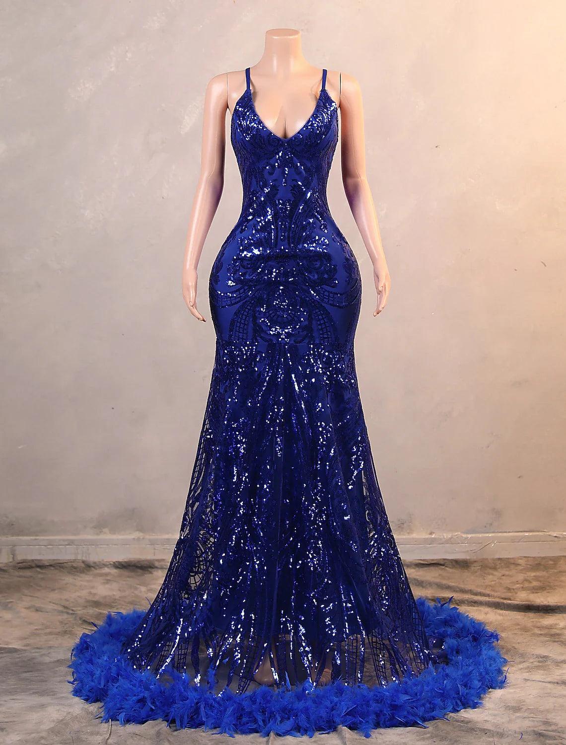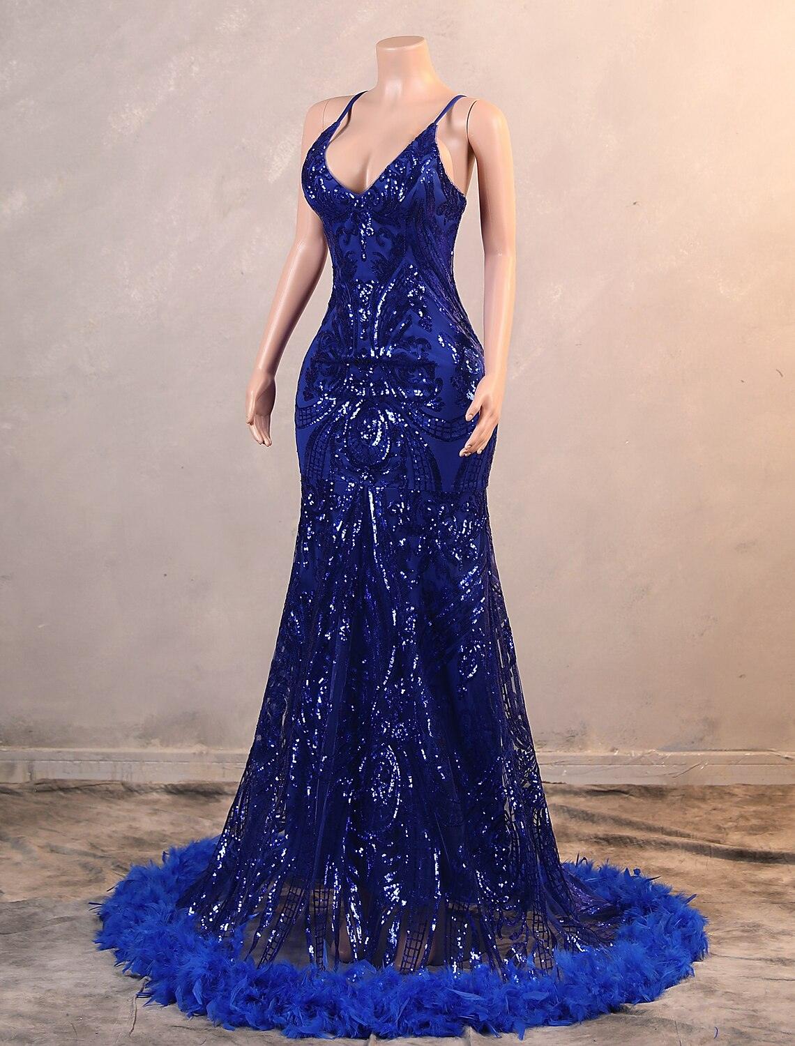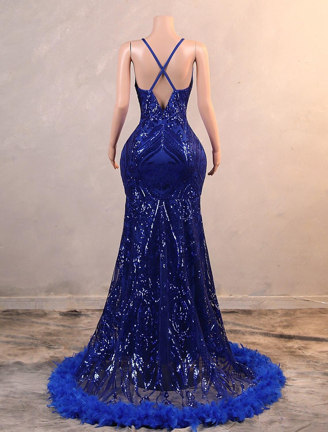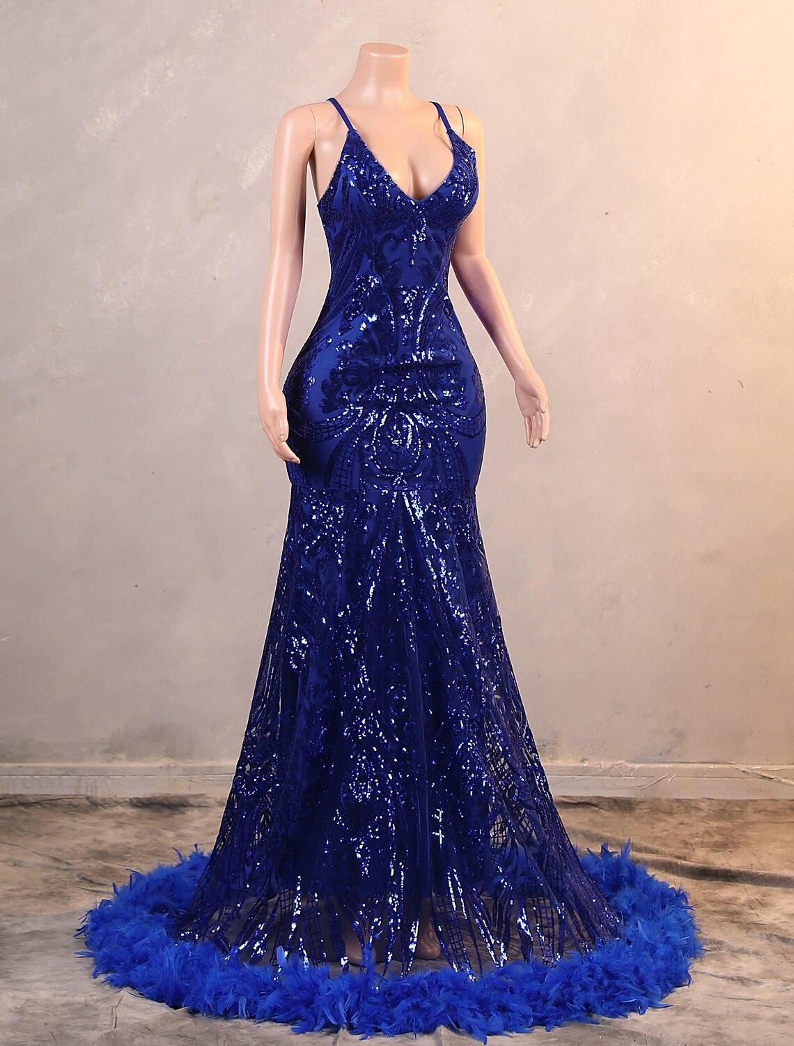 Meerjungfrau/Trompete Abendkleid Luxuriöses Kleid Karneval Bodenlang Ärmellos Spaghettiträger Afroamerikaner Pailletten mit Federstickerei