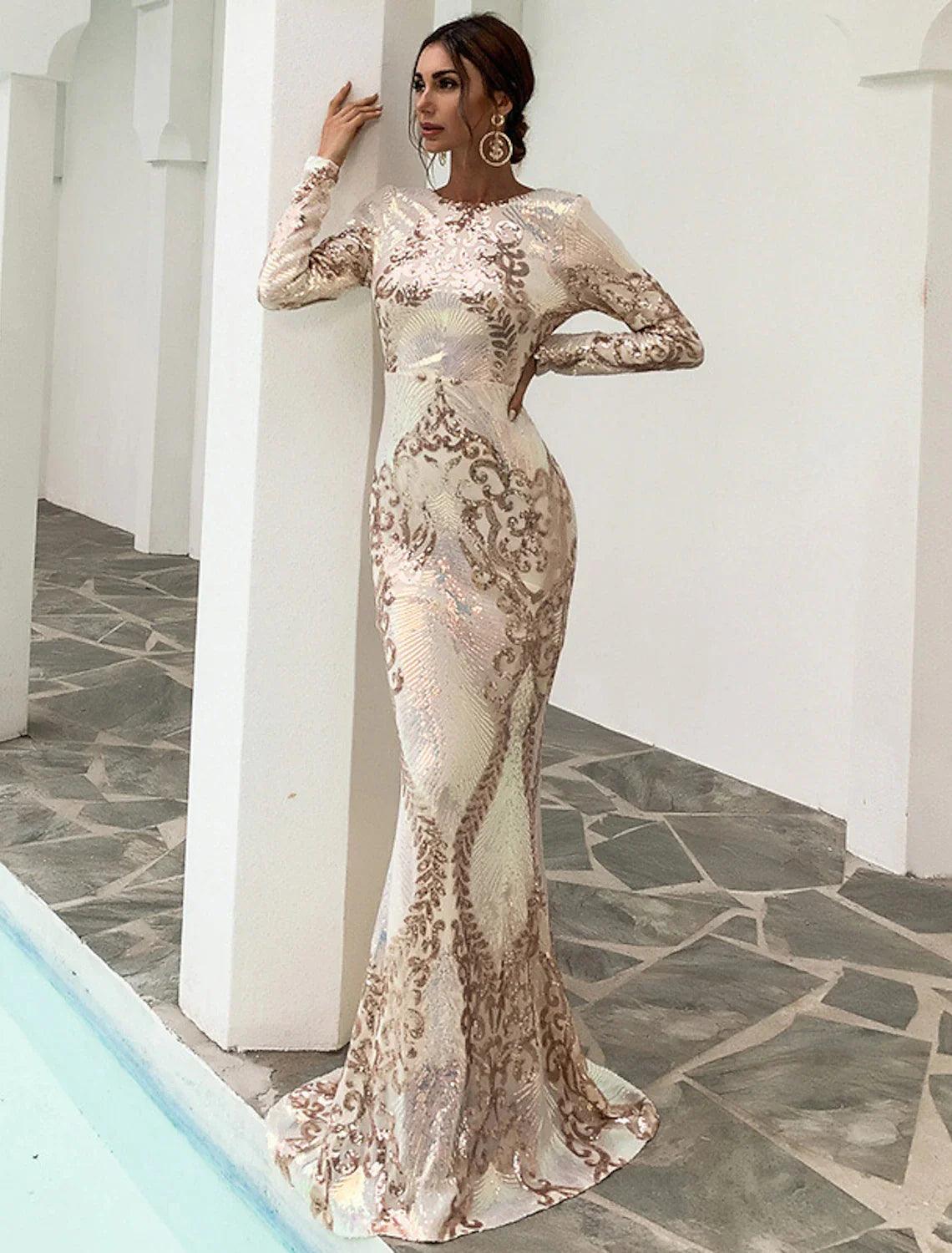 Meerjungfrau / Trompete Abendkleid Sexy Kleid Formell Sweep / Pinsel Schleppe Lange Ärmel Schmucksache-Ausschnitt Polyester Rückenfrei mit Pailletten