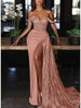 Meerjungfrau/Trompete Abendkleid Sexy Kleid Formeller Hochzeitsgast Hofschleppe Ärmellos Schulterfrei Charmeuse mit gerafftem Paillettenschlitz