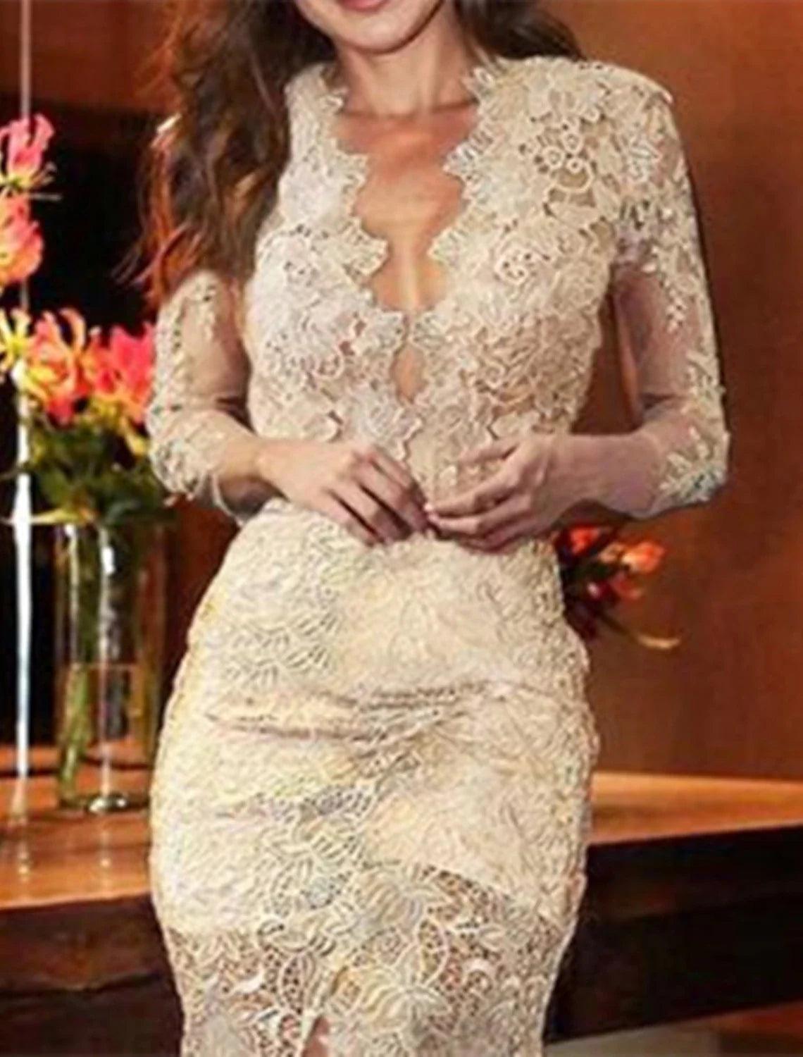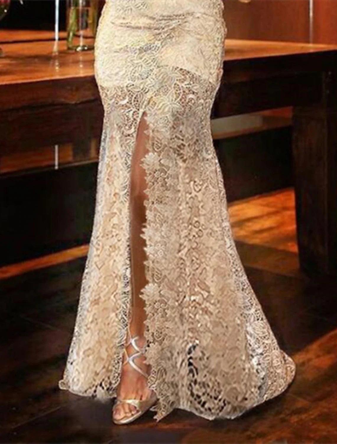 Meerjungfrau/Trompete Abendkleid Sexy Kleid Formeller Hochzeitsgast Sweep/Pinselzug Langarm V-Ausschnitt Herbst Hochzeitsempfang Spitze mit Schlitzapplikationen