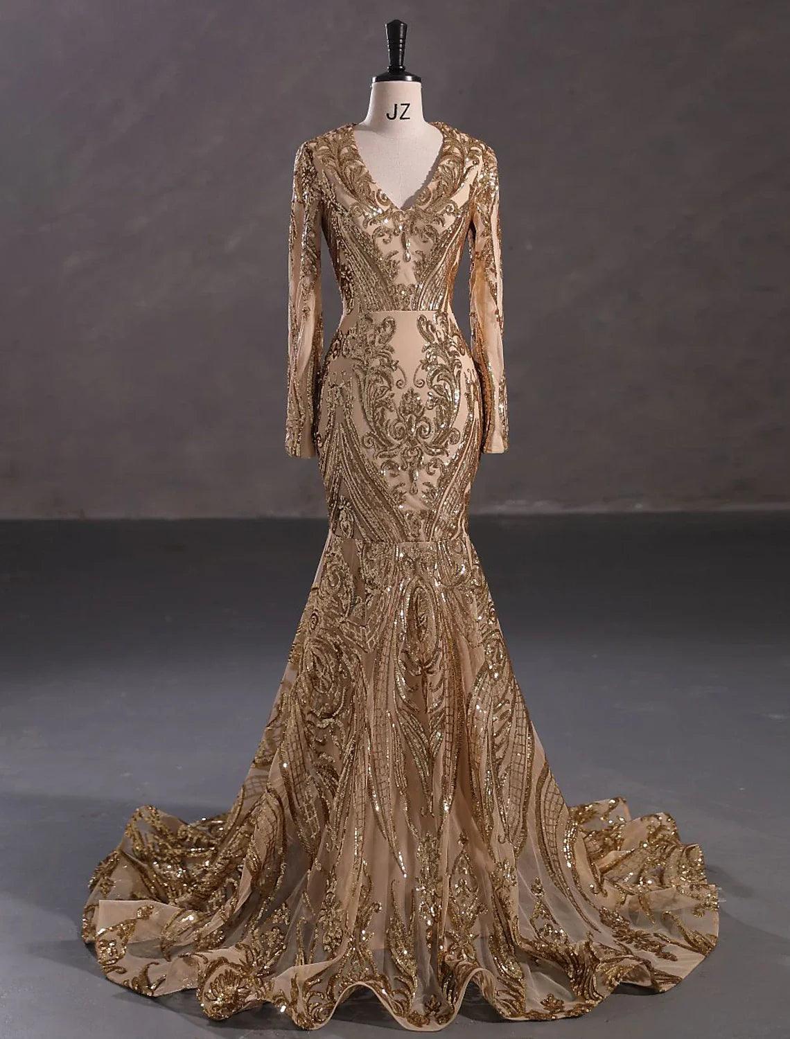 Meerjungfrau/Trompete Abendkleid Sparkle & Shine Kleid Formal Hofschleppe Langarm V-Ausschnitt Afroamerikanische Spitze mit Pailletten