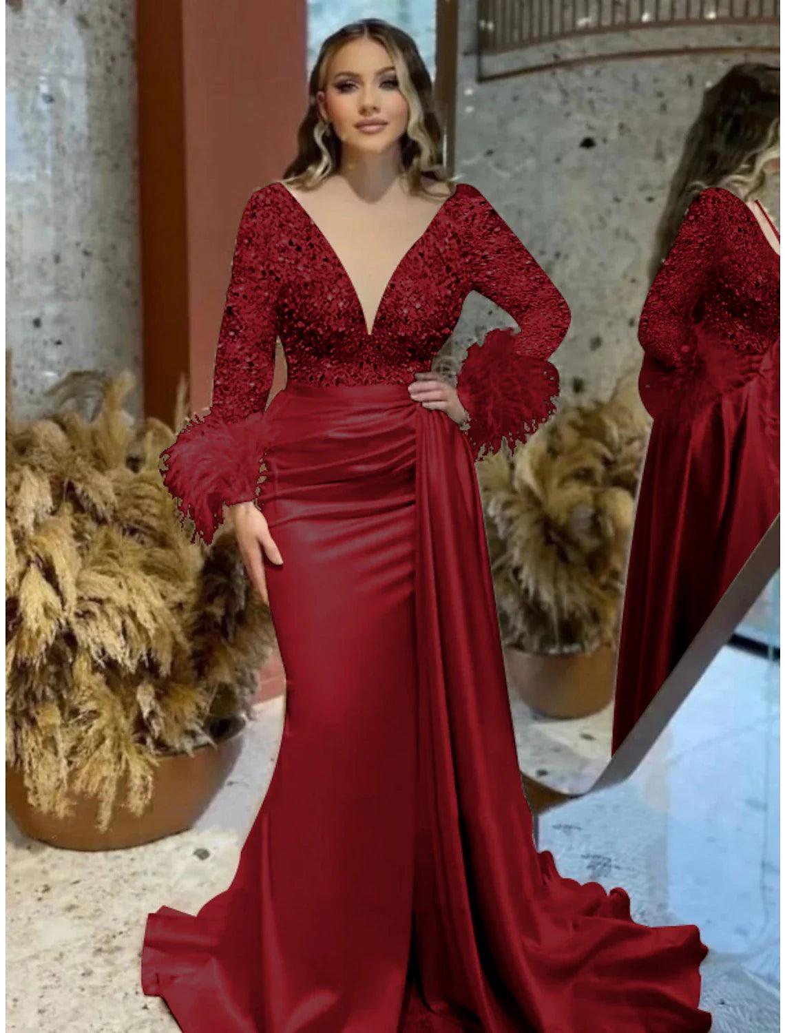 Meerjungfrau/Trompete Abendkleid Sparkle & Shine Kleid Formelle Hochzeit Hofschleppe Langarm V-Ausschnitt Satin mit Feder Glitzer Rüschen