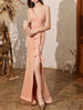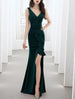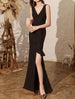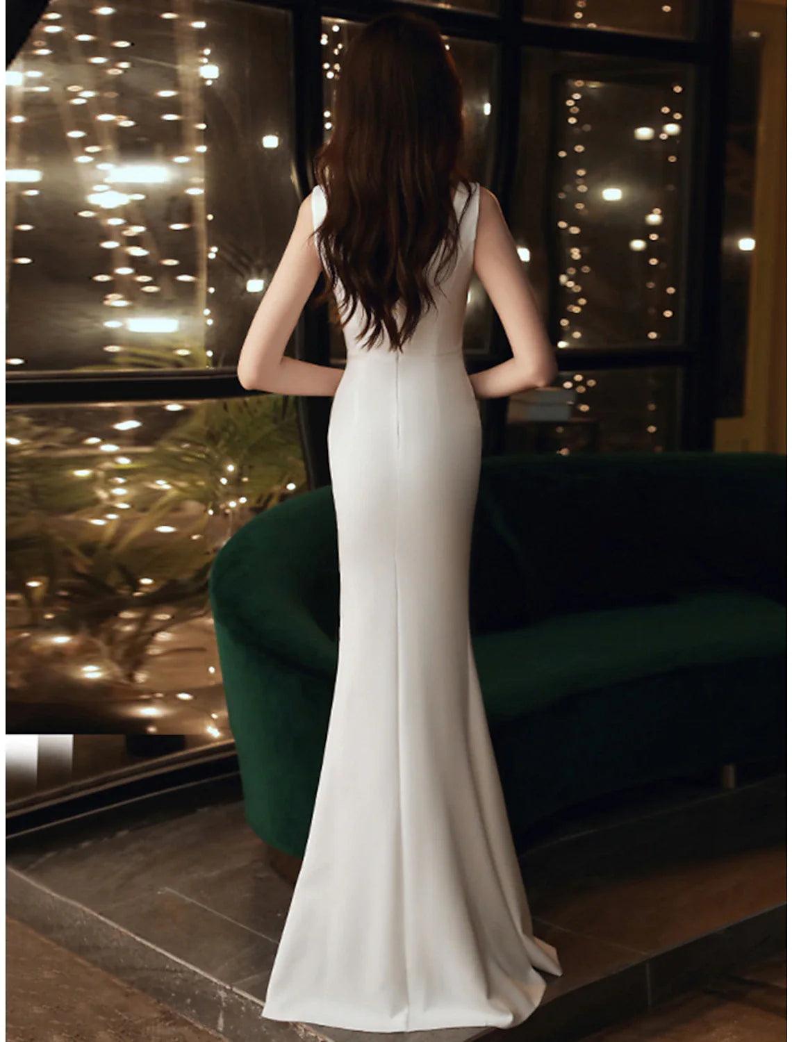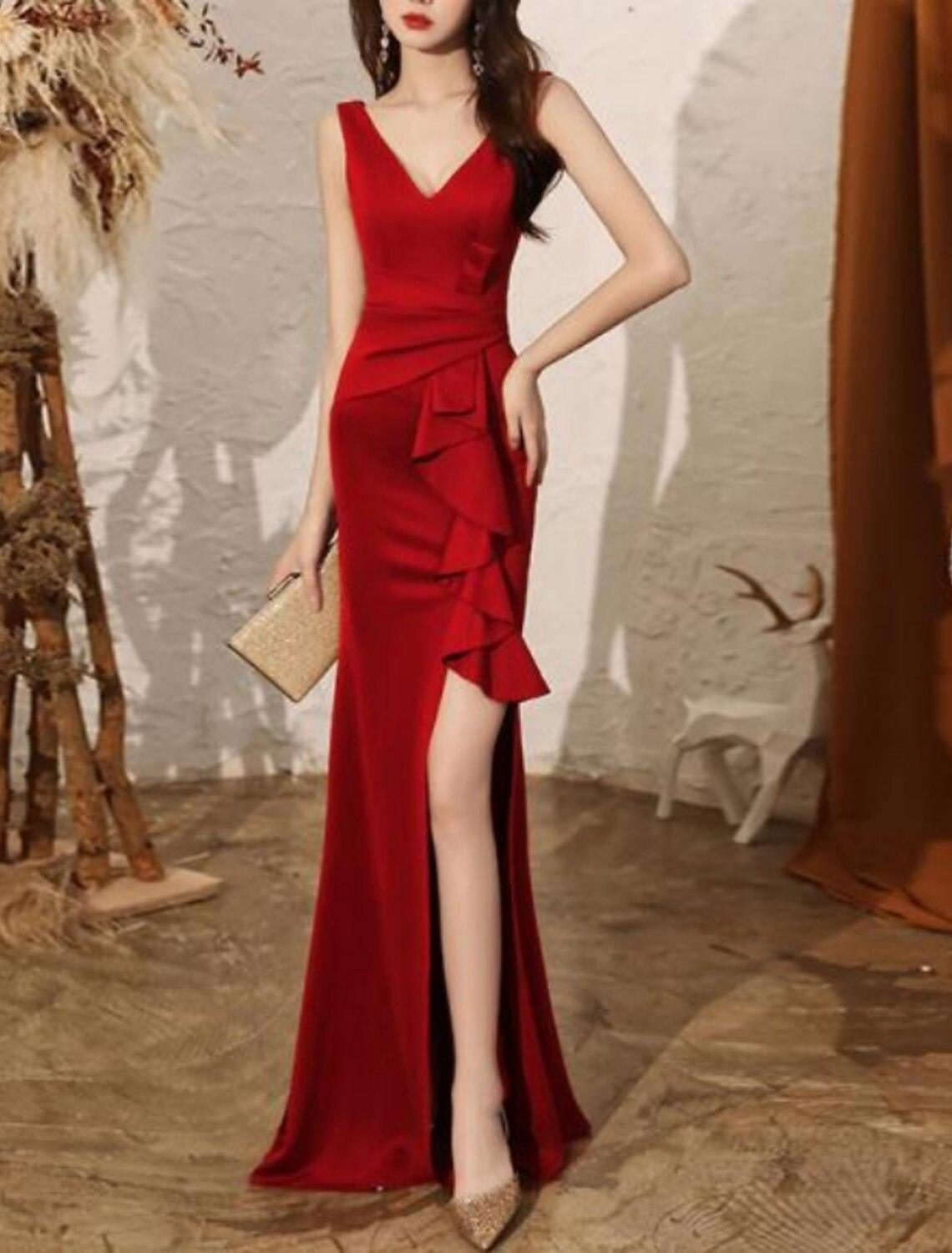 Meerjungfrau/Trompete, minimalistisch, elegant, für Hochzeitsgäste, formelles Abendkleid, V-Ausschnitt, ärmellos, bodenlang, Stretchstoff mit Rüschen, Schlitz