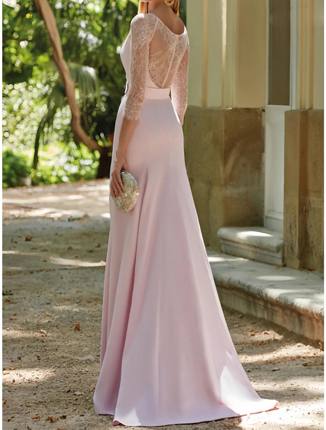 Meerjungfrau/Trompete Kleid für die Brautmutter, Hochzeitsgast, eleganter Rundhalsausschnitt, Schleppe, Stretch-Stoff, 3/4-Ärmel mit Spitze, Schlitz vorne, Rüschen