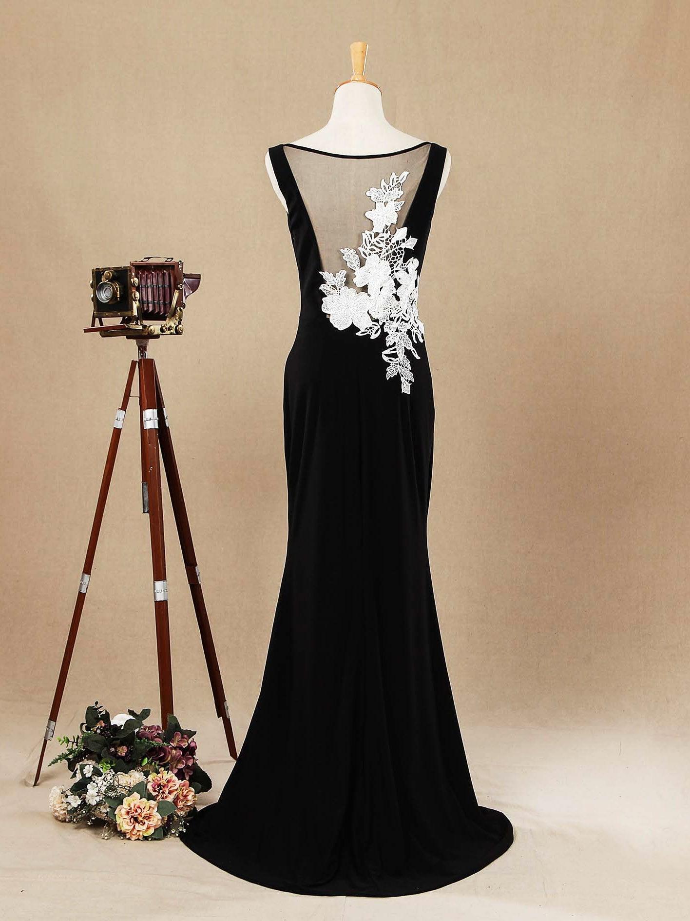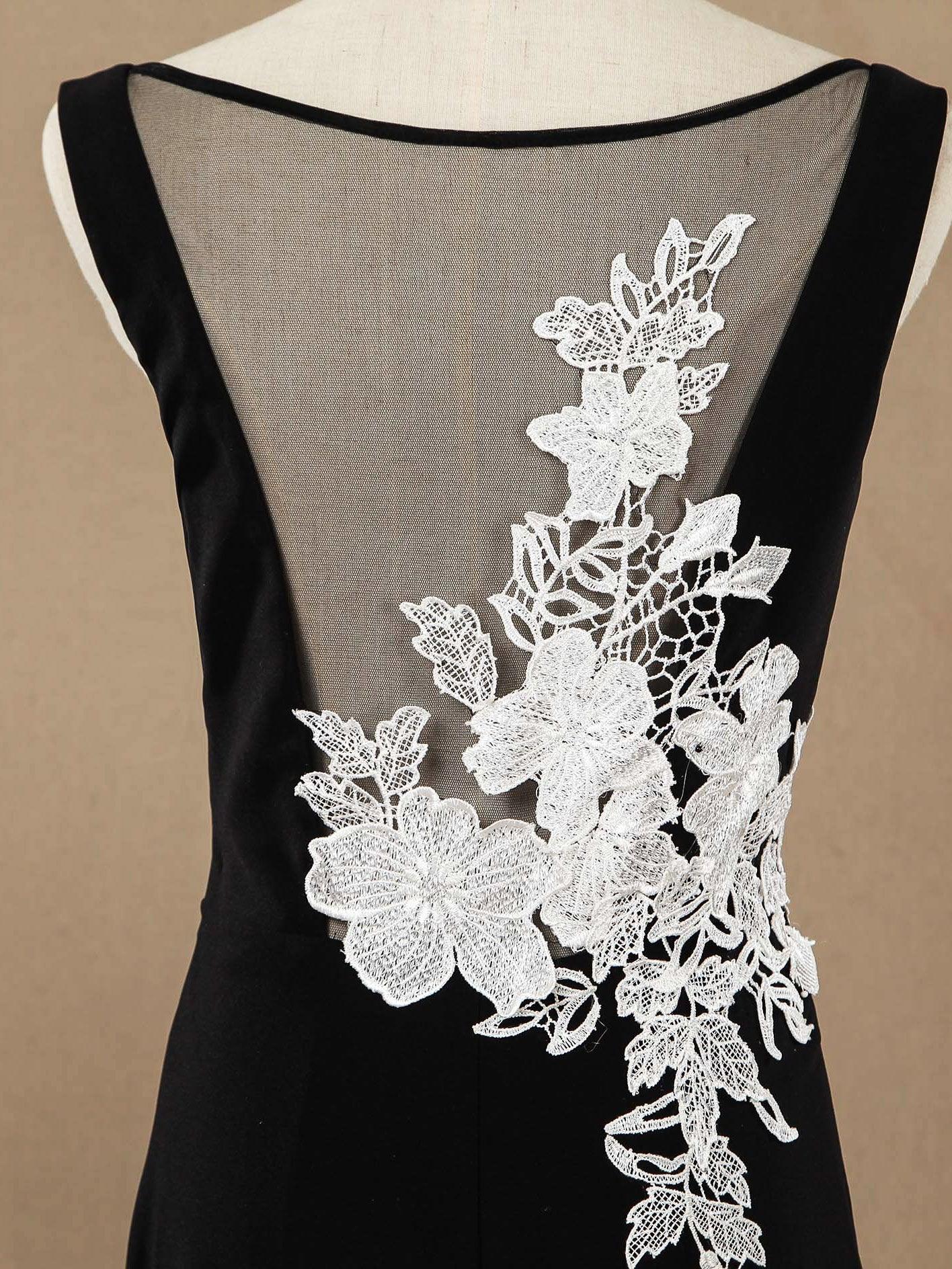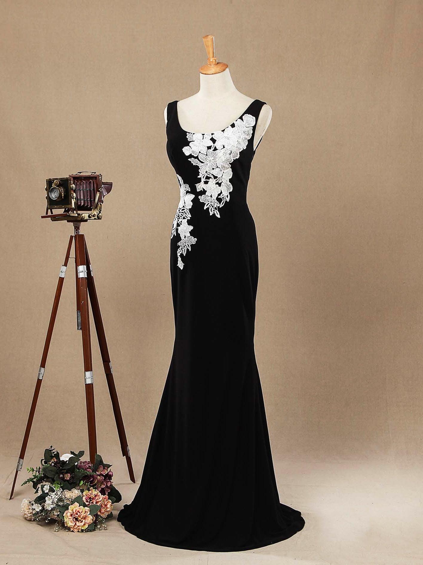 Meerjungfrau/Trompete, bodenlanges Abendkleid aus Chiffon mit U-Ausschnitt, Trägern und weißen Applikationen, durchsichtiger Rücken, auf Bestellung gefertigt.