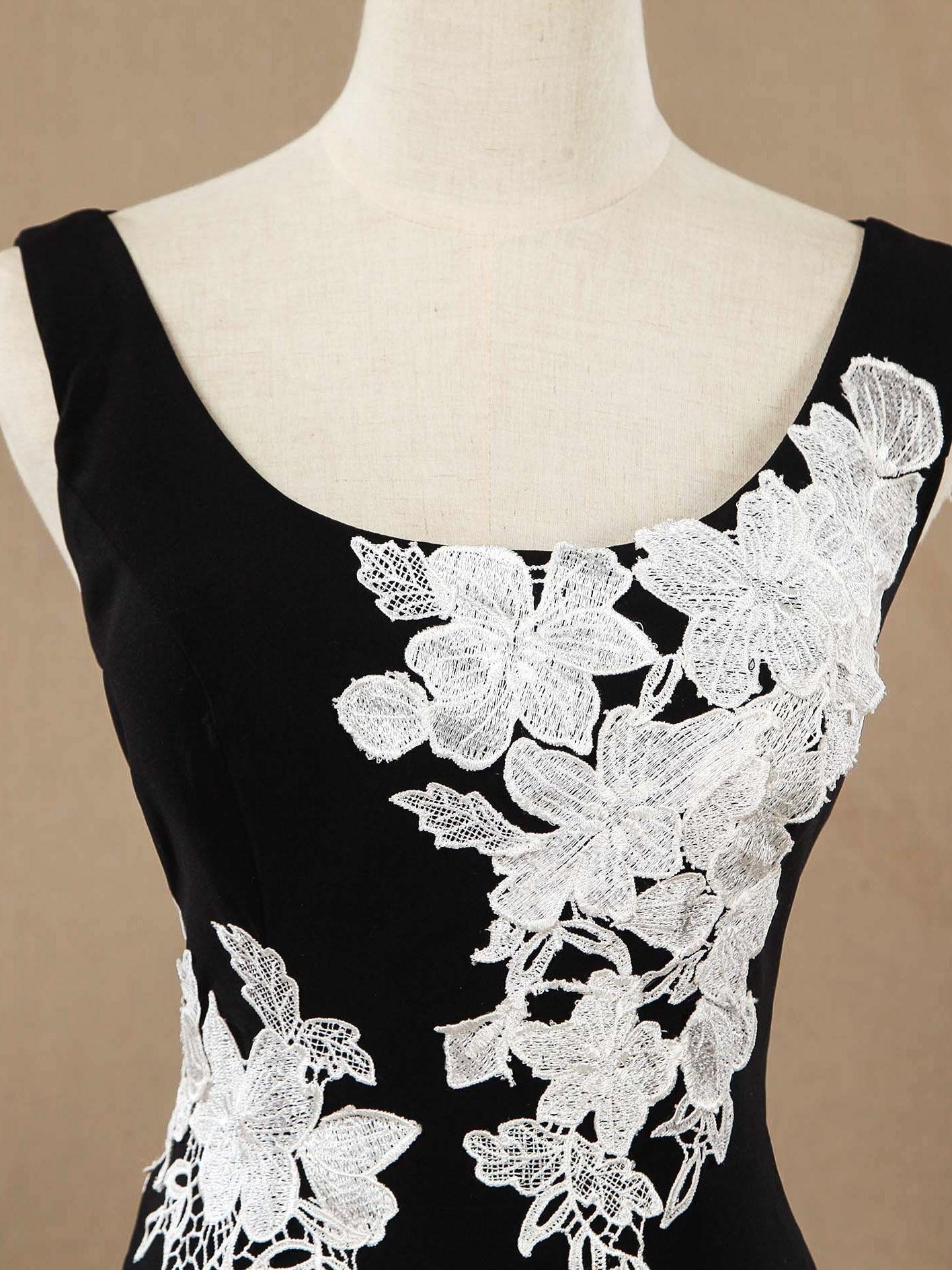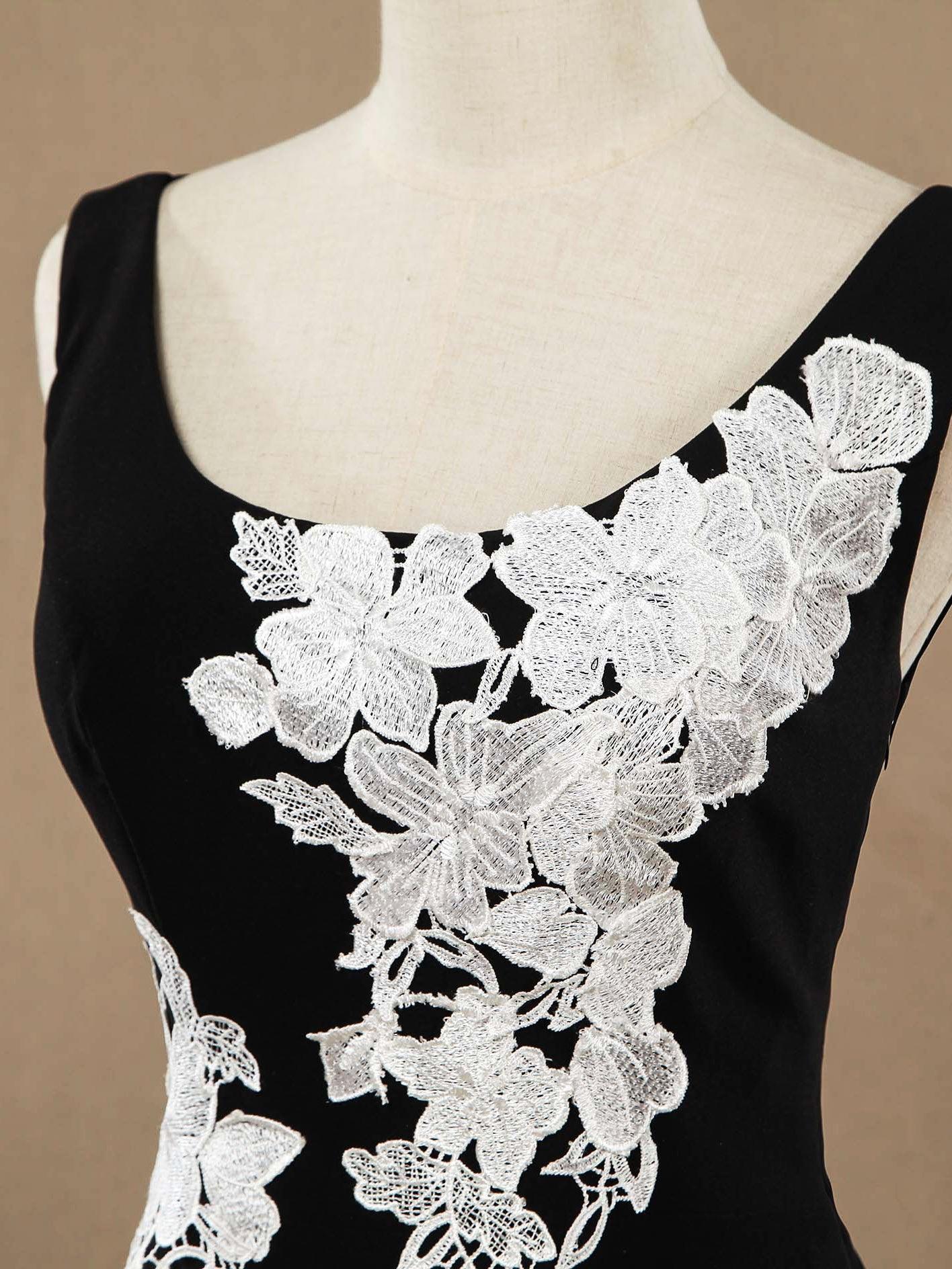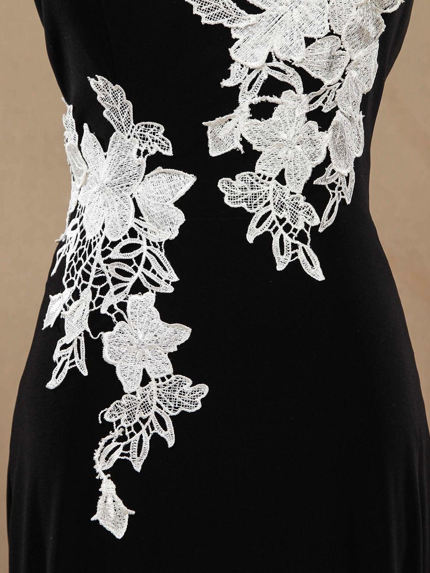 Meerjungfrau/Trompete, bodenlanges Abendkleid aus Chiffon mit U-Ausschnitt, Trägern und weißen Applikationen, durchsichtiger Rücken, auf Bestellung gefertigt.