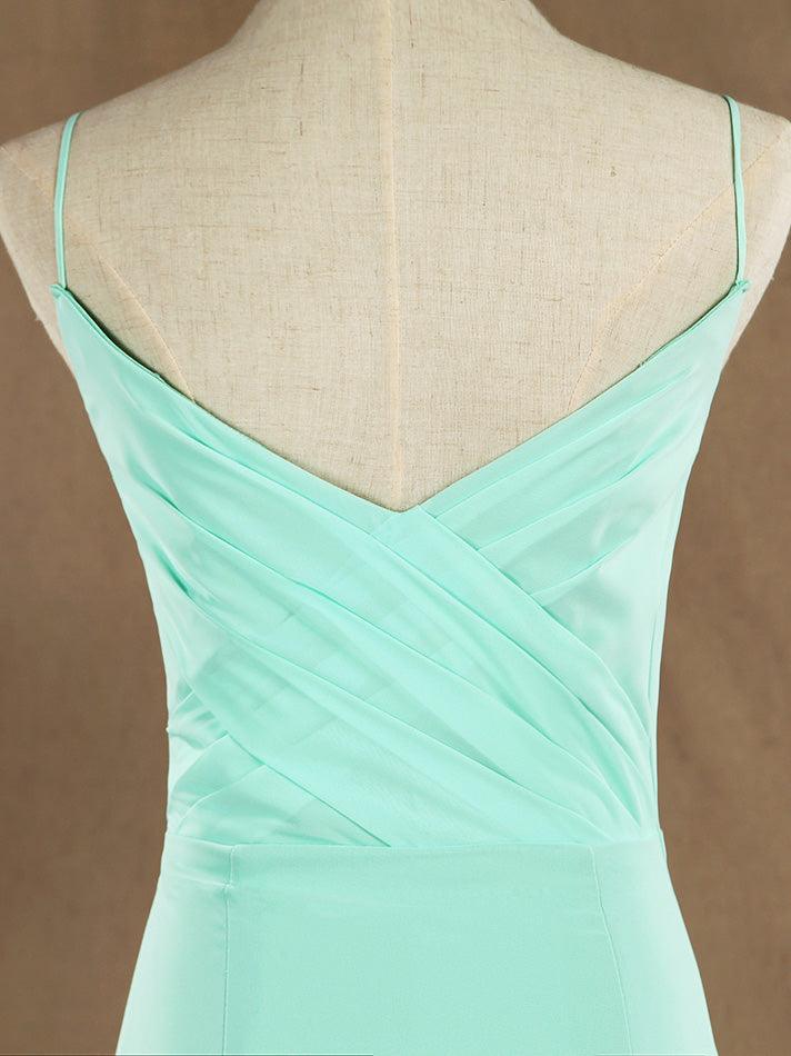 1. Bodenlanges Brautjungfernkleid aus Chiffon mit Spaghettiträgern im Meerjungfrauen-/Trompeten-Stil und Schleppe, auf Bestellung gefertigt.