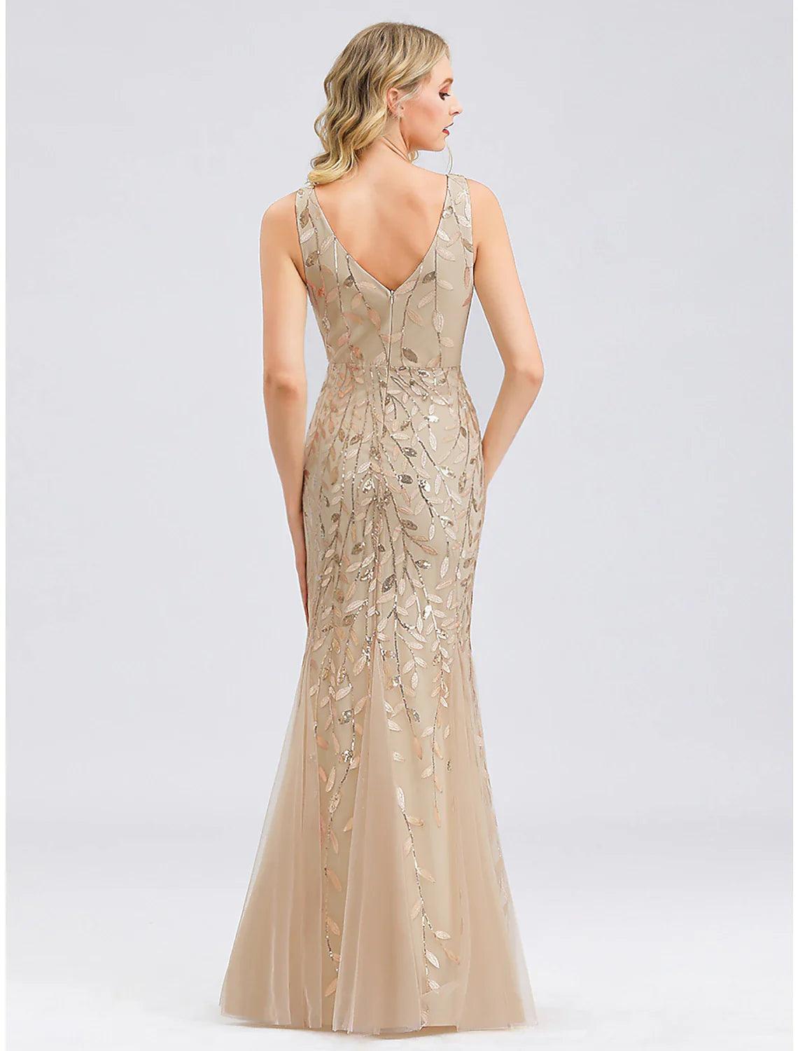 Meerjungfrau/Trompete funkeln sexy Ballkleid formelles Abendkleid Valentinstag V-Ausschnitt V-Rücken ärmellos bodenlang Tüll mit Paillettenapplikationen