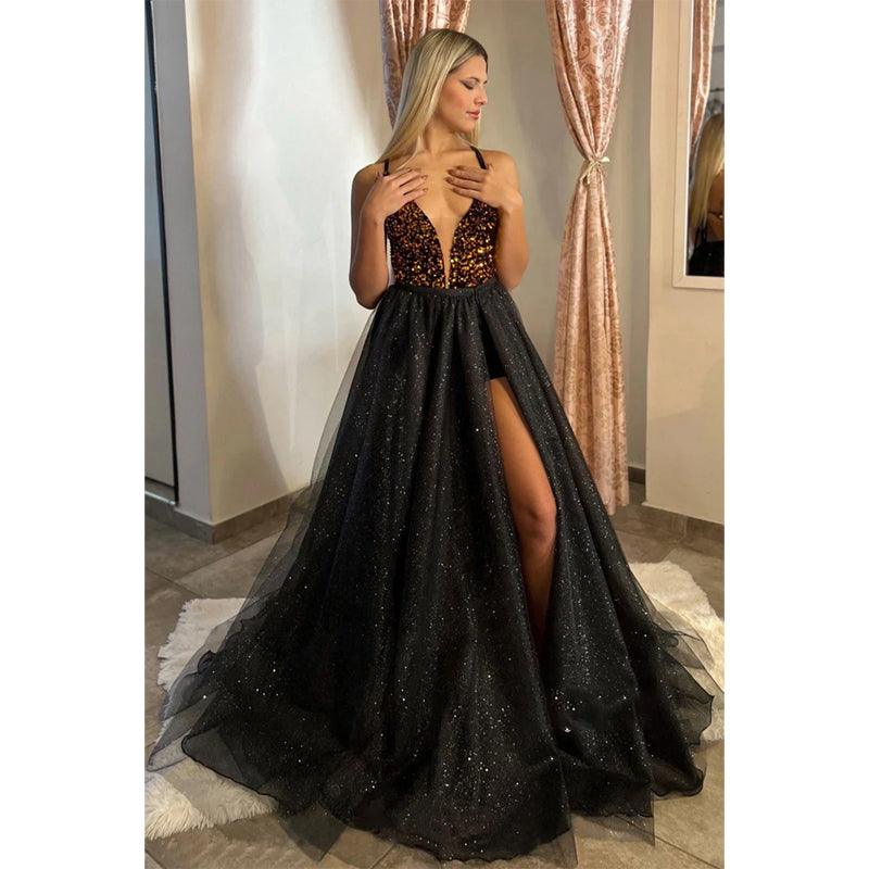 Tiefer V-Ausschnitt Abnehmbarer Rock Glitzerndes Ballkleid Lang