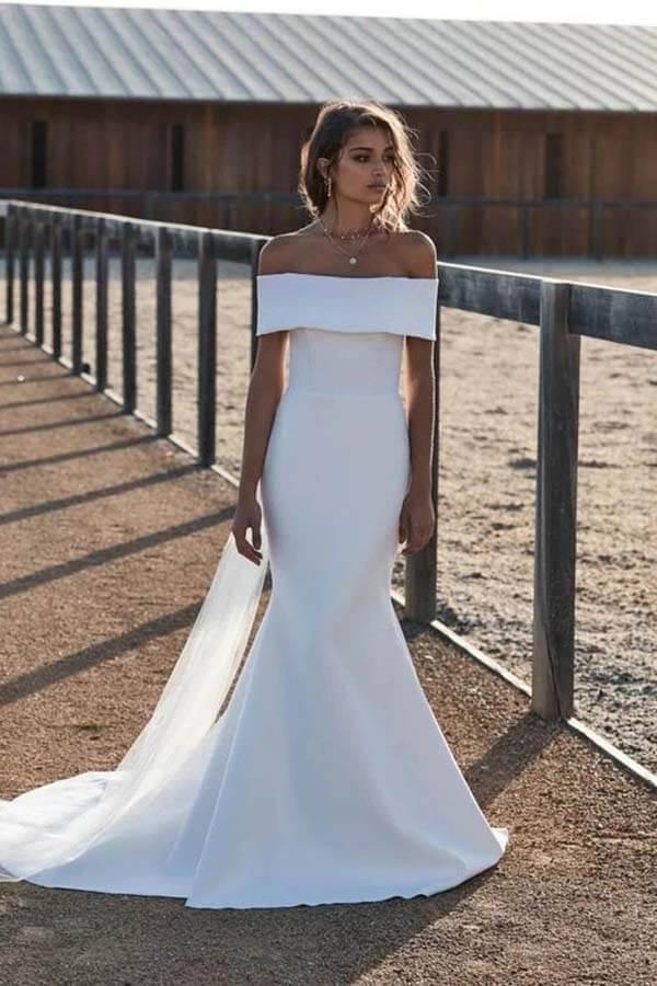 Schlichte schulterfreie Brautkleider im Meerjungfrauen-Stil in Elfenbein. Brautkleider. MW696