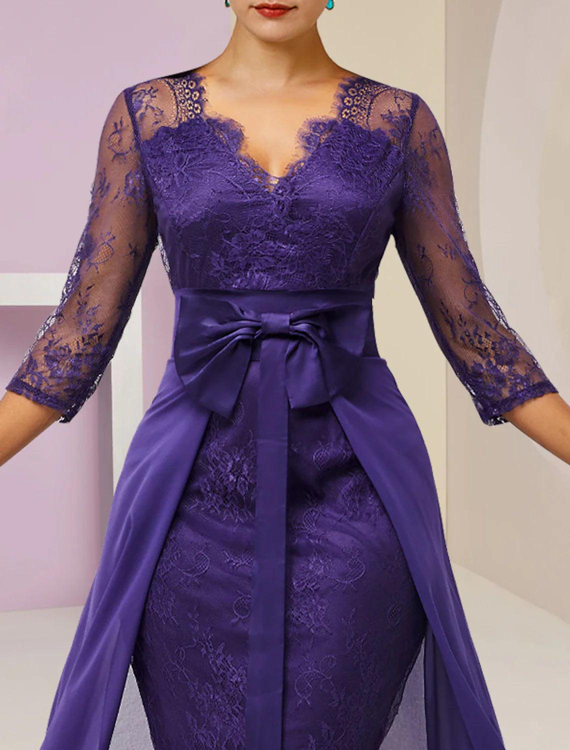 Zweiteiliges Etuikleid/Säulenkleid für die Mutter der Braut, formelle Herbsthochzeitsgäste, elegant, abnehmbar, V-Ausschnitt, knielang, Chiffon, Spitze, 3/4-Ärmel mit Schleife(n)