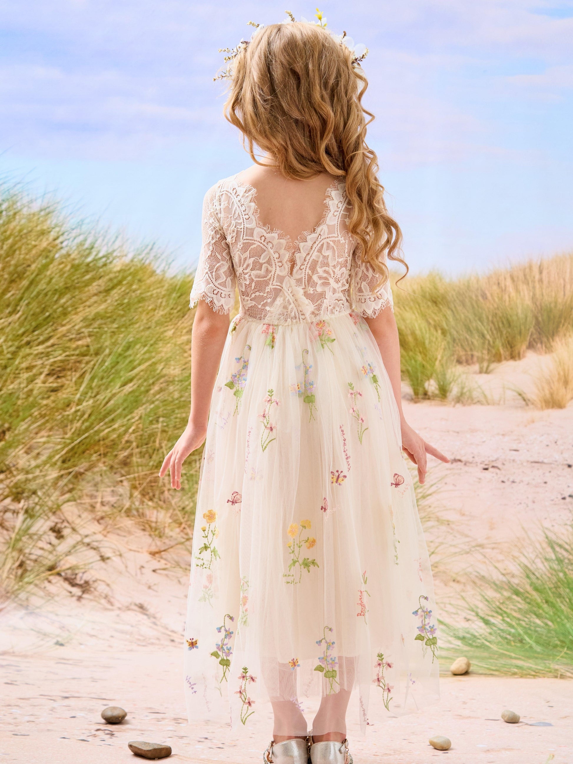 Vestido de fiesta para niñas de flores Numbersea blanco con hombros descubiertos y mangas 1/2 - Marfil