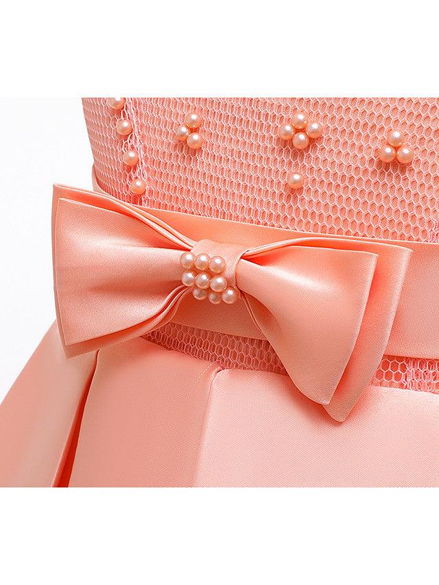 Código de producto: 227095 Adorno: Abalorios.Lazo Tela: Satén Silueta: Línea A/Princesa Escote: Cuello redondo Manga: Sin mangas Dobladillo/Cola: Largo hasta el suelo Estilo de espalda: Botón cubierto. Espalda en V Color mostrado: rosa Grupo de edad: Niña grande, Niña pequeña- $82.80