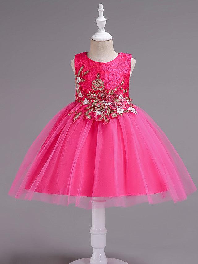 Vestido rosa para niña con bordado floral, lentejuelas y tul hasta la rodilla - Rosa ruborizado
