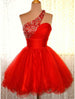 Vestidos de fiesta de corte A, brillantes y con brillo, para graduaciones, cortos/mini, sin mangas, de un solo hombro, de tul rosa con lentejuelas