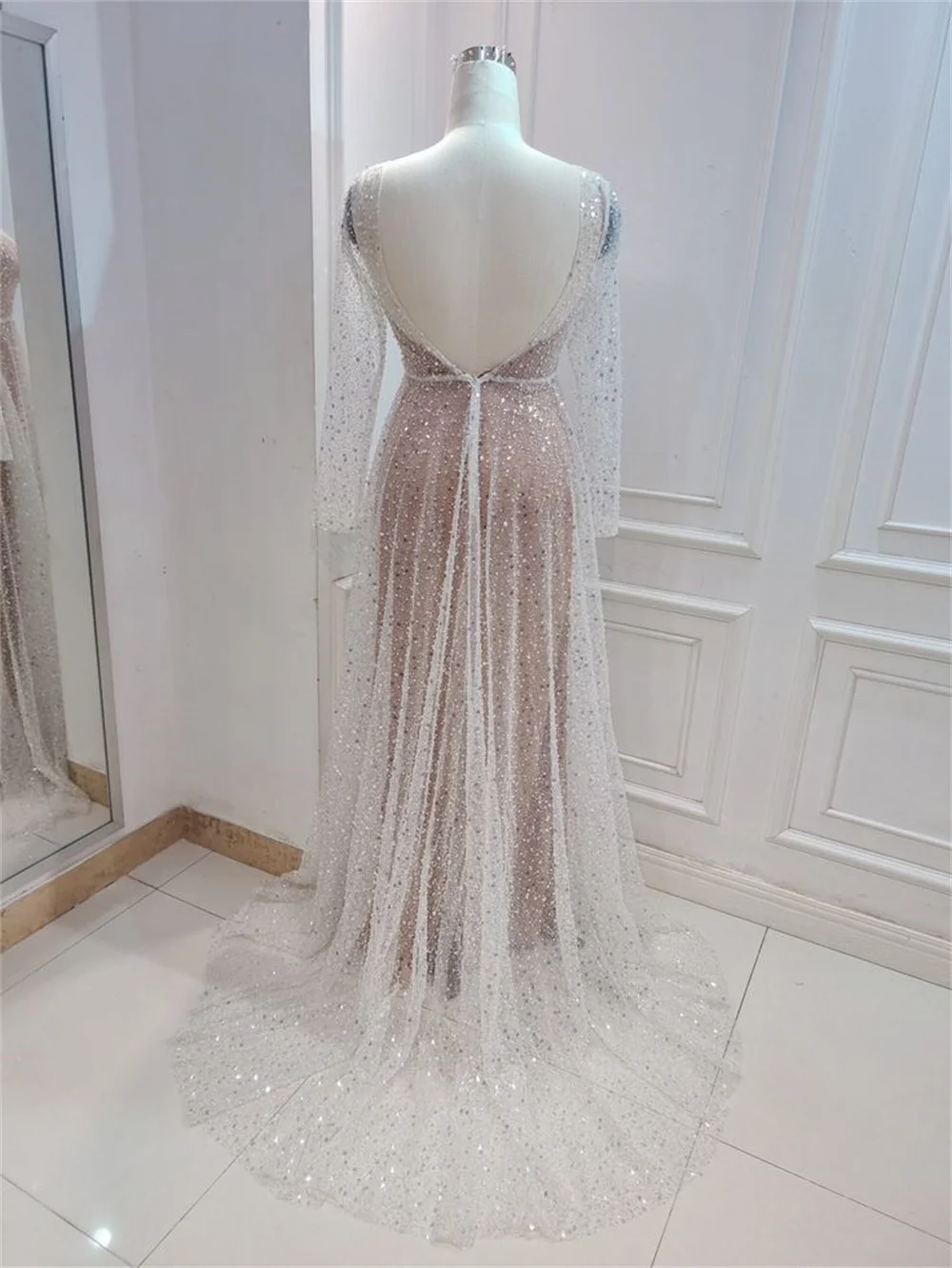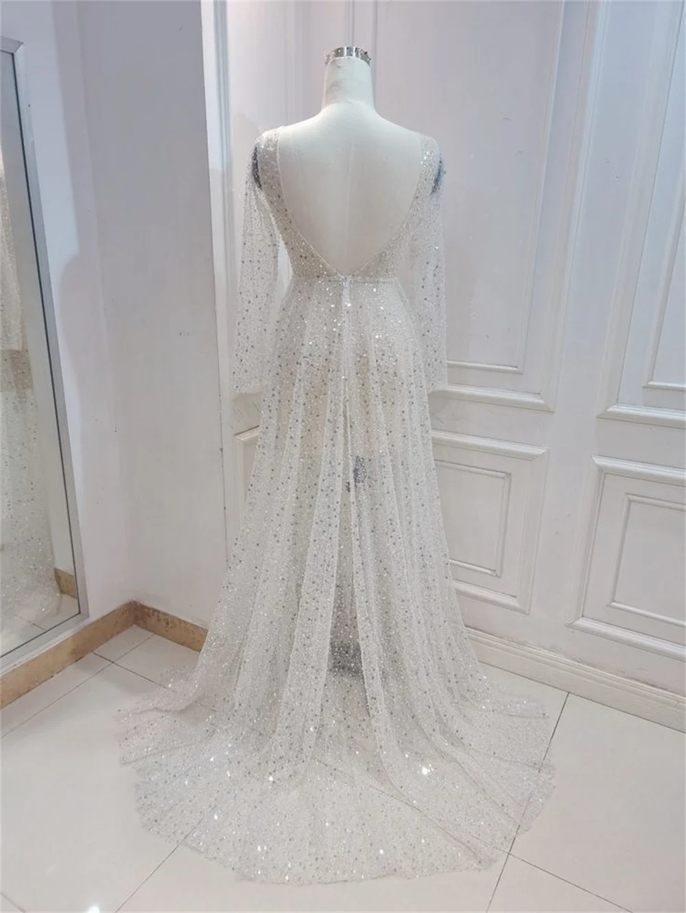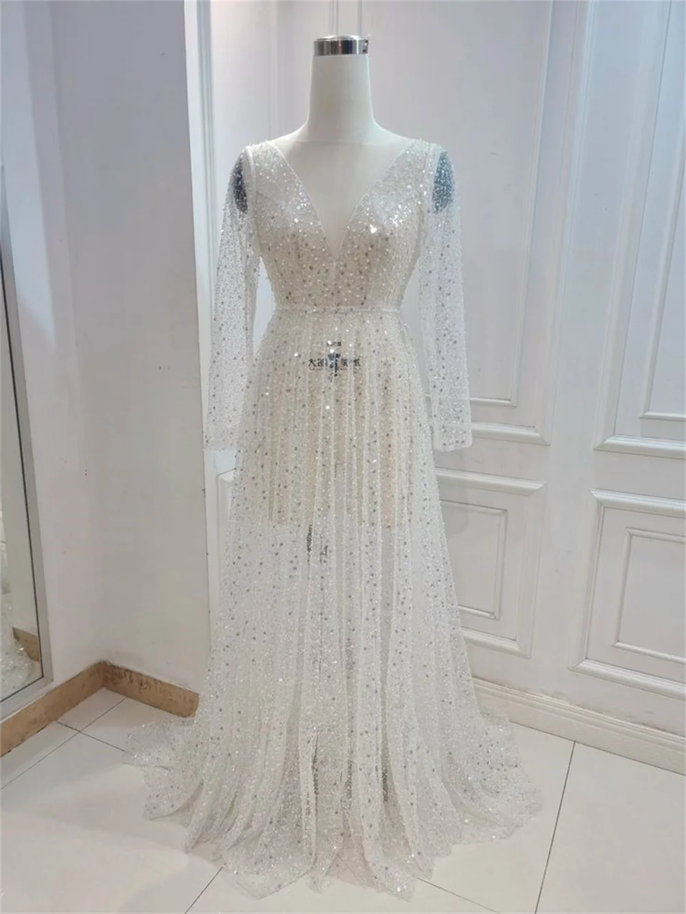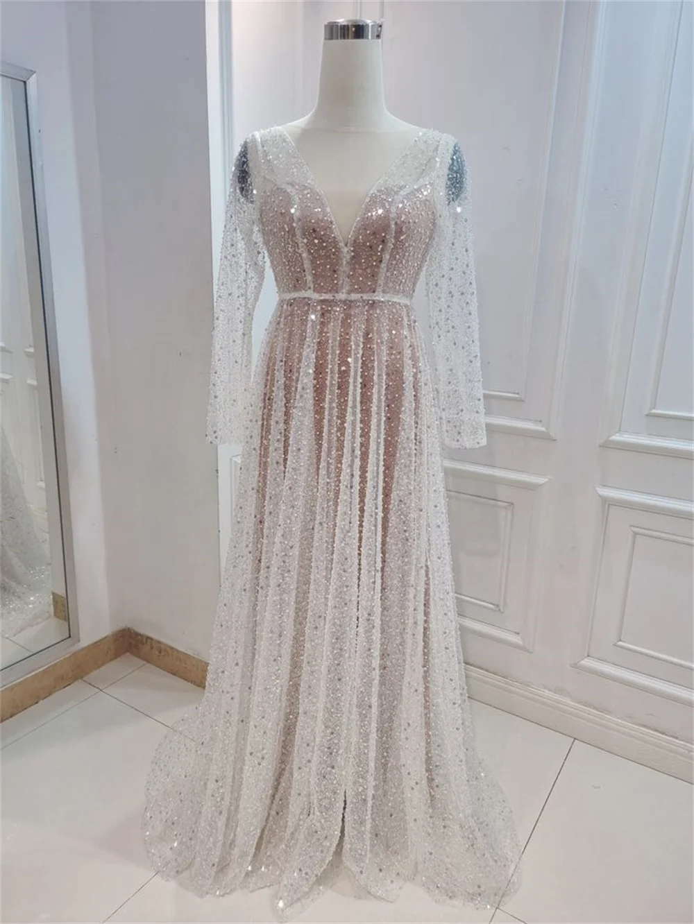 Vestidos de novia con encaje brillante, corte A, escote en V profundo, mangas largas transparentes.