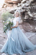 Vestido de novia de manga corta, corte A y top de tul azul con encaje. MW628