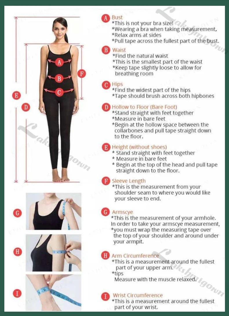 Un vestido con la talla perfecta empieza con las medidas perfectas. Antes de pedir un vestido a medida en Aliexpress.com, te recomendamos encarecidamente que busques un sastre profesional local que pueda ayudarte a tomar las medidas con precisión. Aquí te mostraremos qué medidas necesitas y cómo tomarlas correctamente. ¡Advertencia: medirse en casa es más complicado de lo que crees! Para obtener los mejores resultados, siempre pide a un sastre profesional local que te tome las medidas.