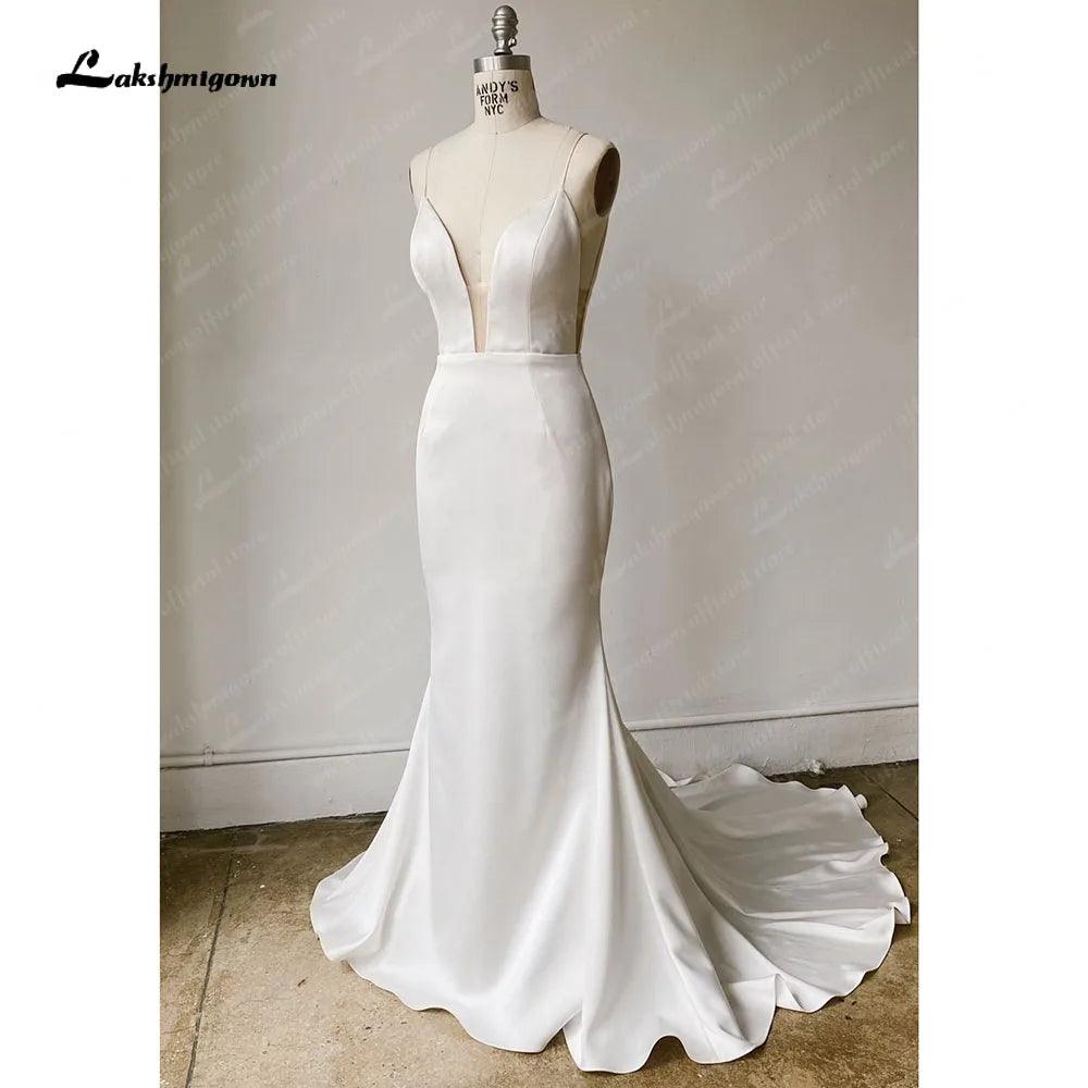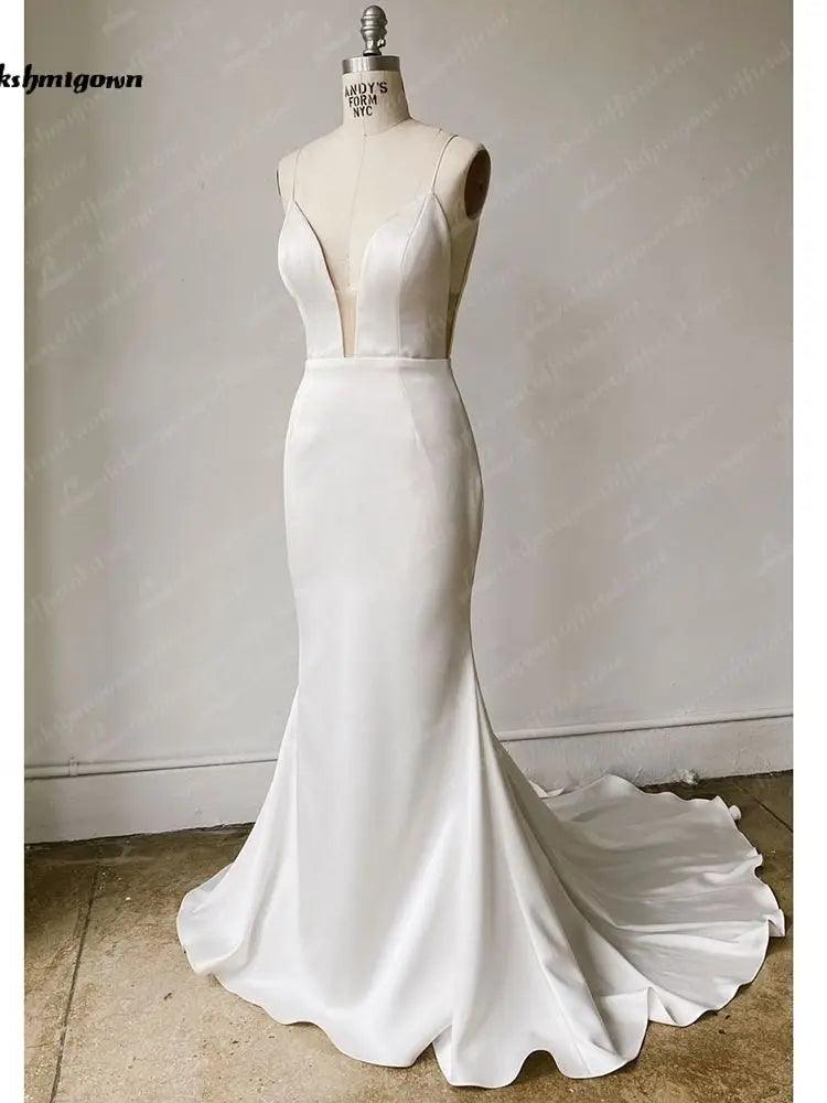 NumberSea Simple Satin Wedding Dress Spaghetti Straps Long Train Backless Buttons Draped Trailing V Neck Bridal Gowns