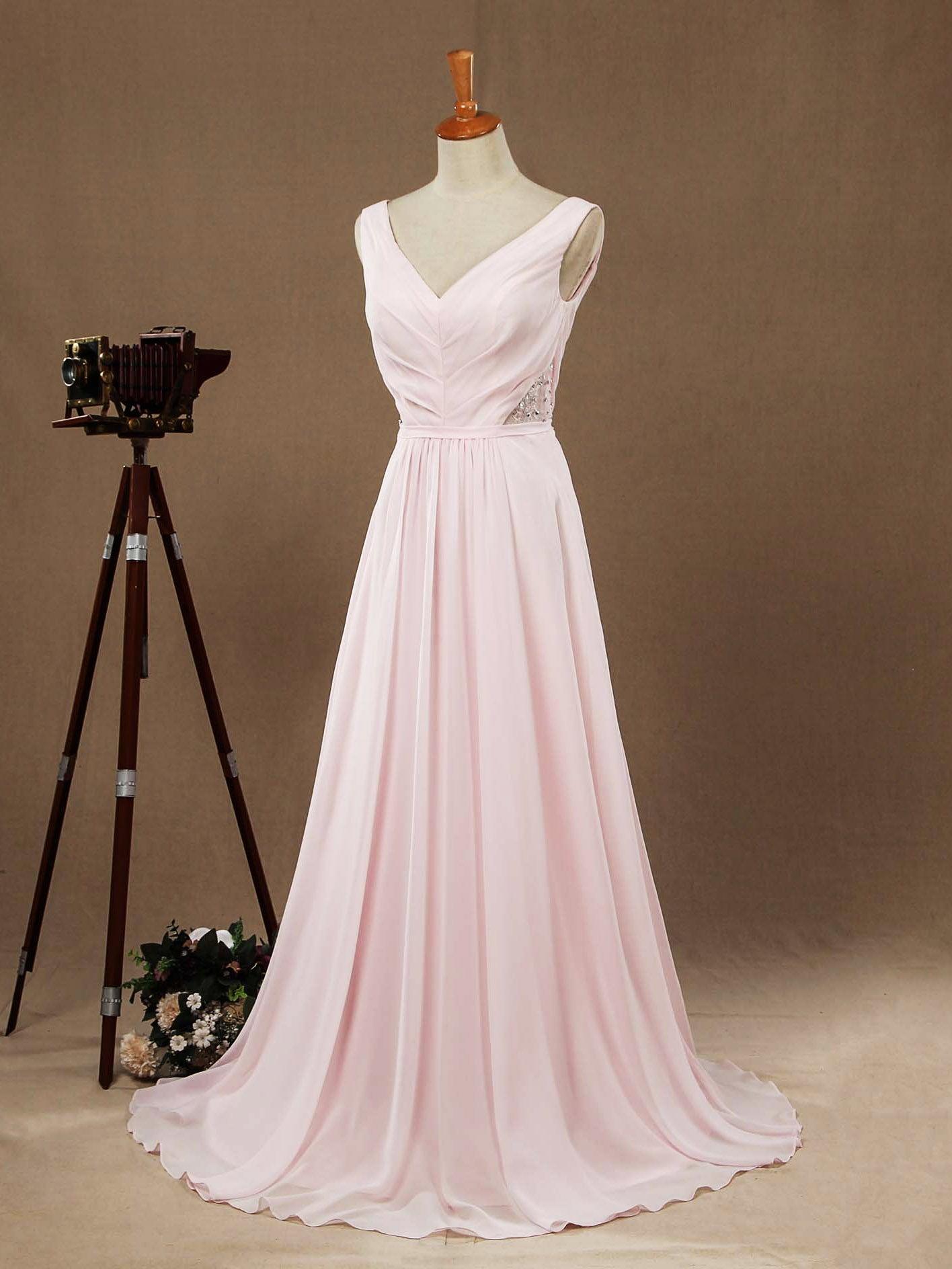 1. Vestido largo de dama de honor en gasa, escote en V, espalda en V, tirantes, fruncido y decoración de cuentas. Hecho a pedido.