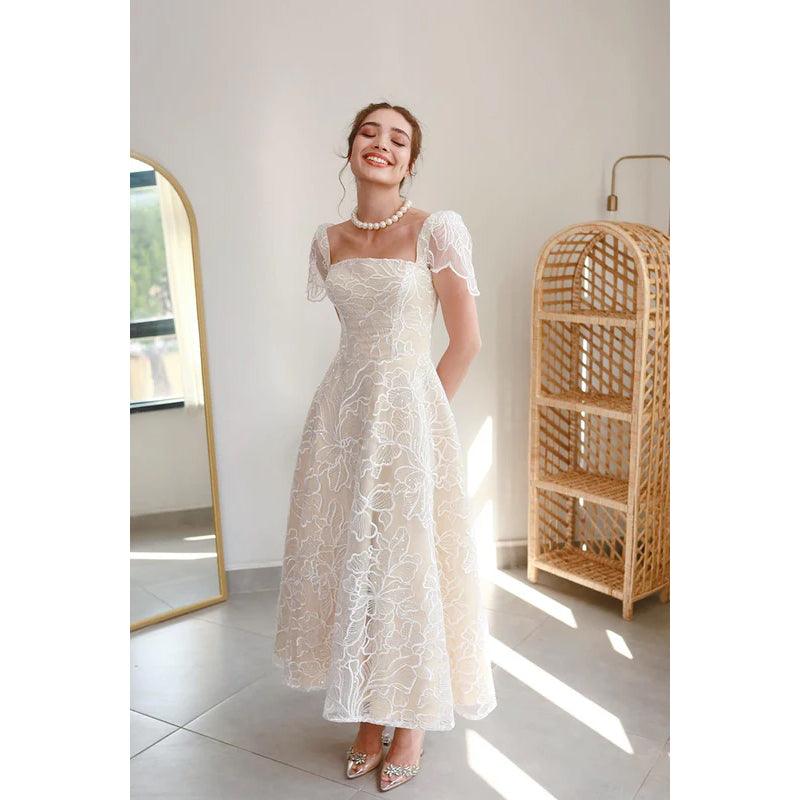 Square Neck Cup Sleeves Print Tulle A-Line Tea Lenght Evening Prom Dress
