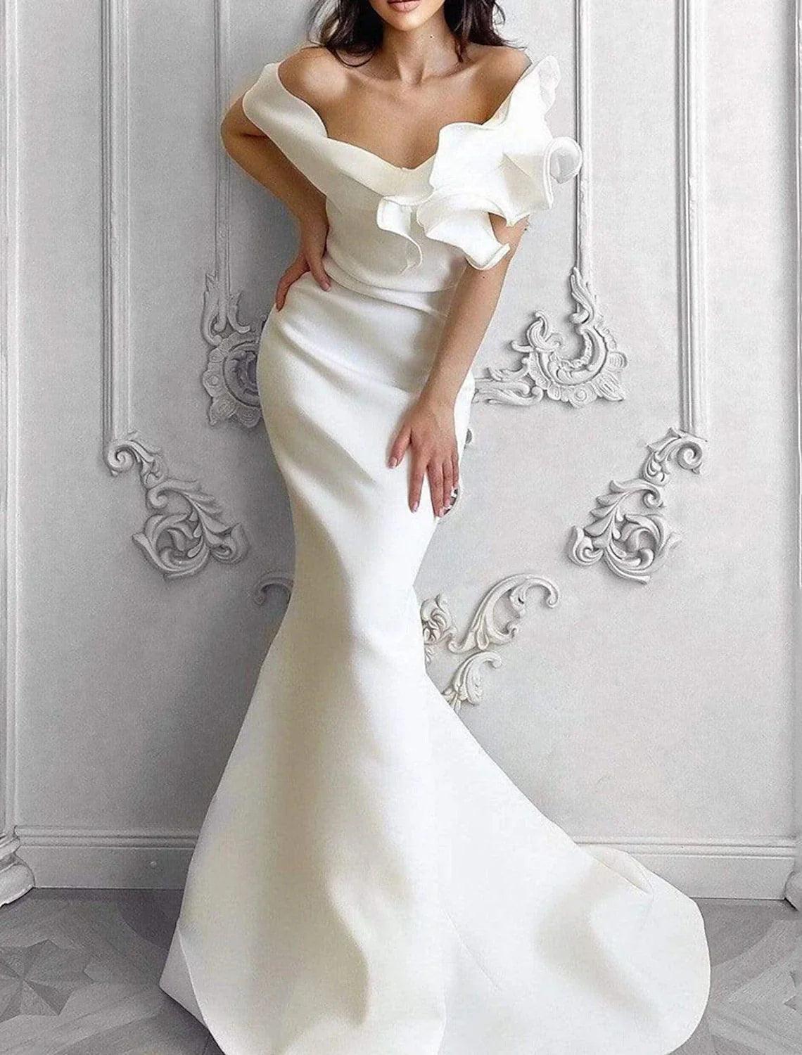 Vestido de noche largo estilo sirena/trompeta, vestido formal para invitadas de boda, cola de corte, sin mangas, cuello en V, tejido elástico con volantes