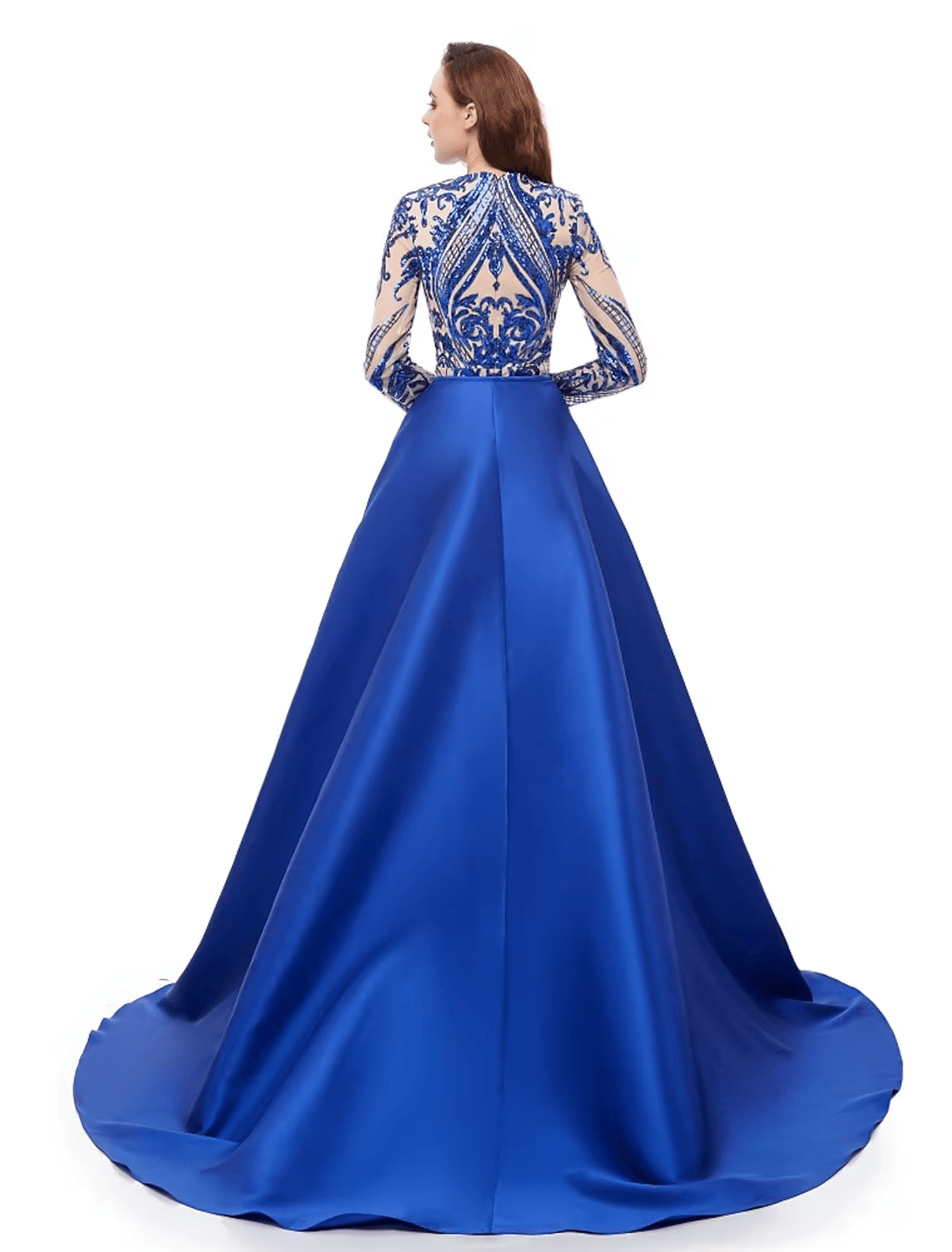 Vestido de noche formal de sirena/trompeta lujoso con brillo y brillo, manga larga, cuello joya, manga larga, cola de corte, satén con lentejuelas, estampado/estampado