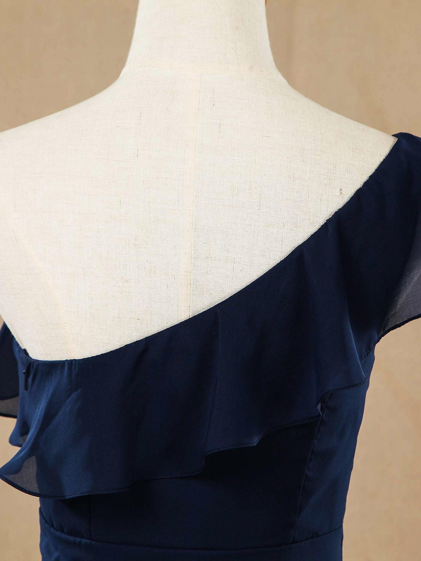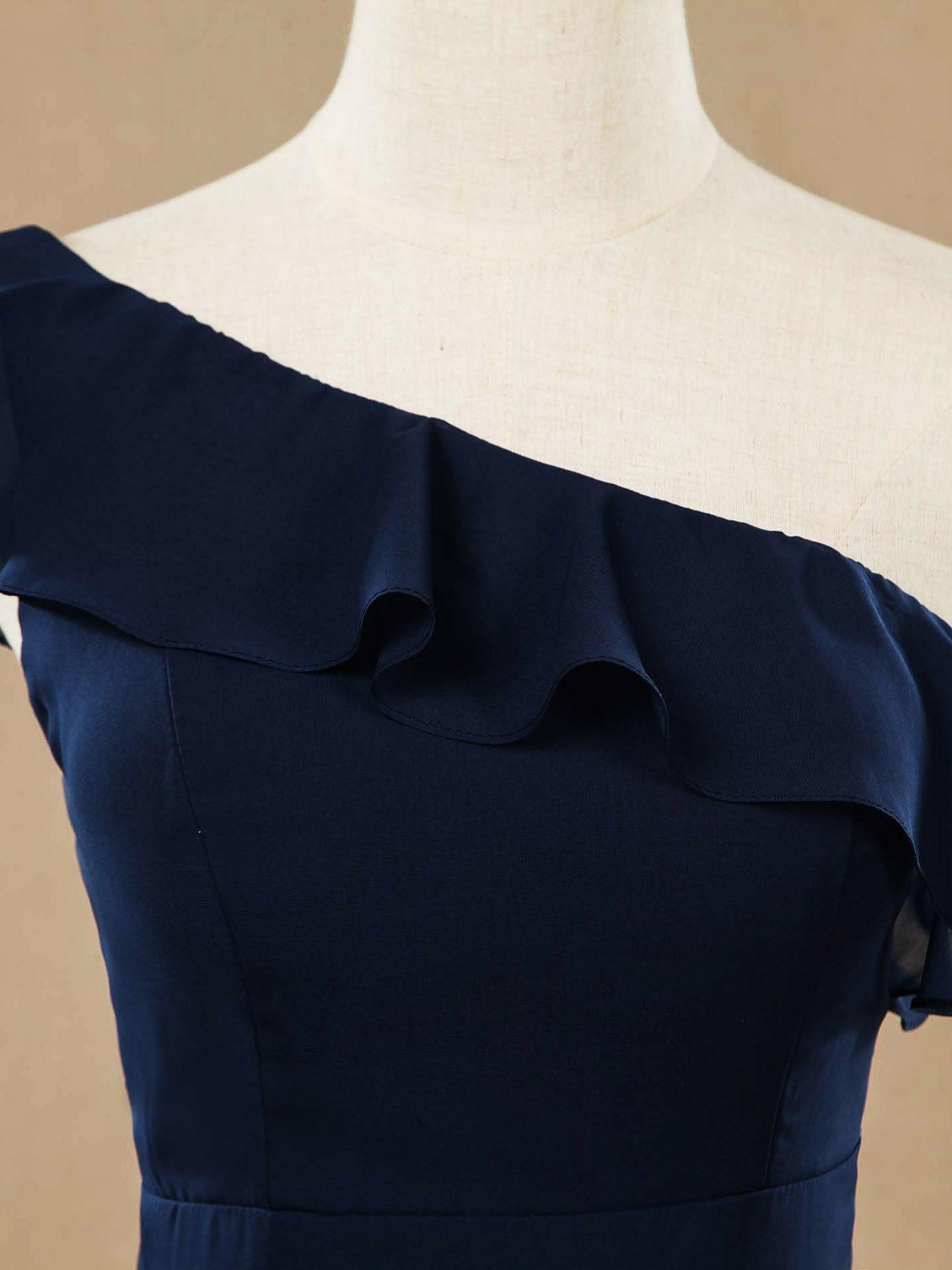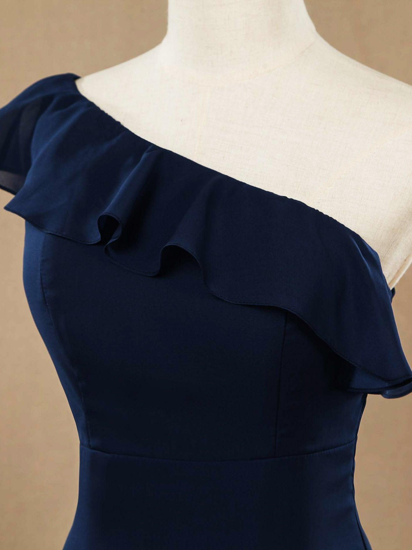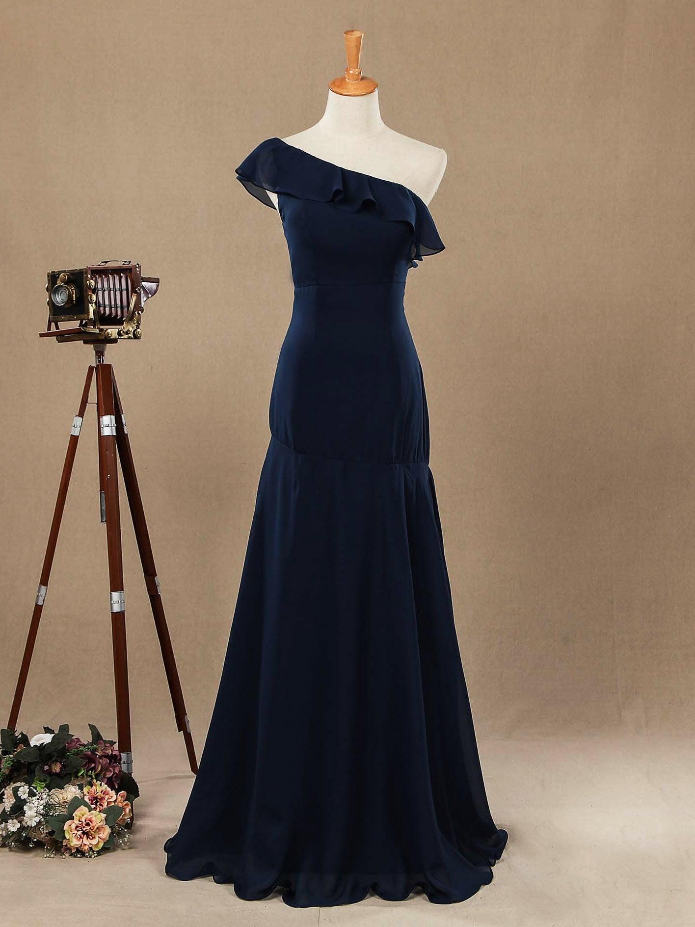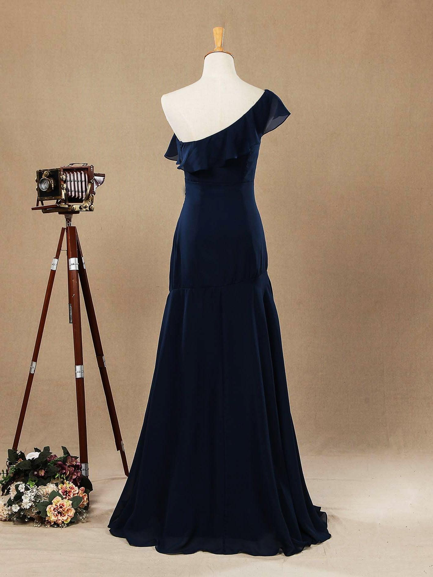 Vestido de noche formal de gasa hasta el suelo con un hombro al descubierto y corte sirena/trompeta, hecho a pedido.