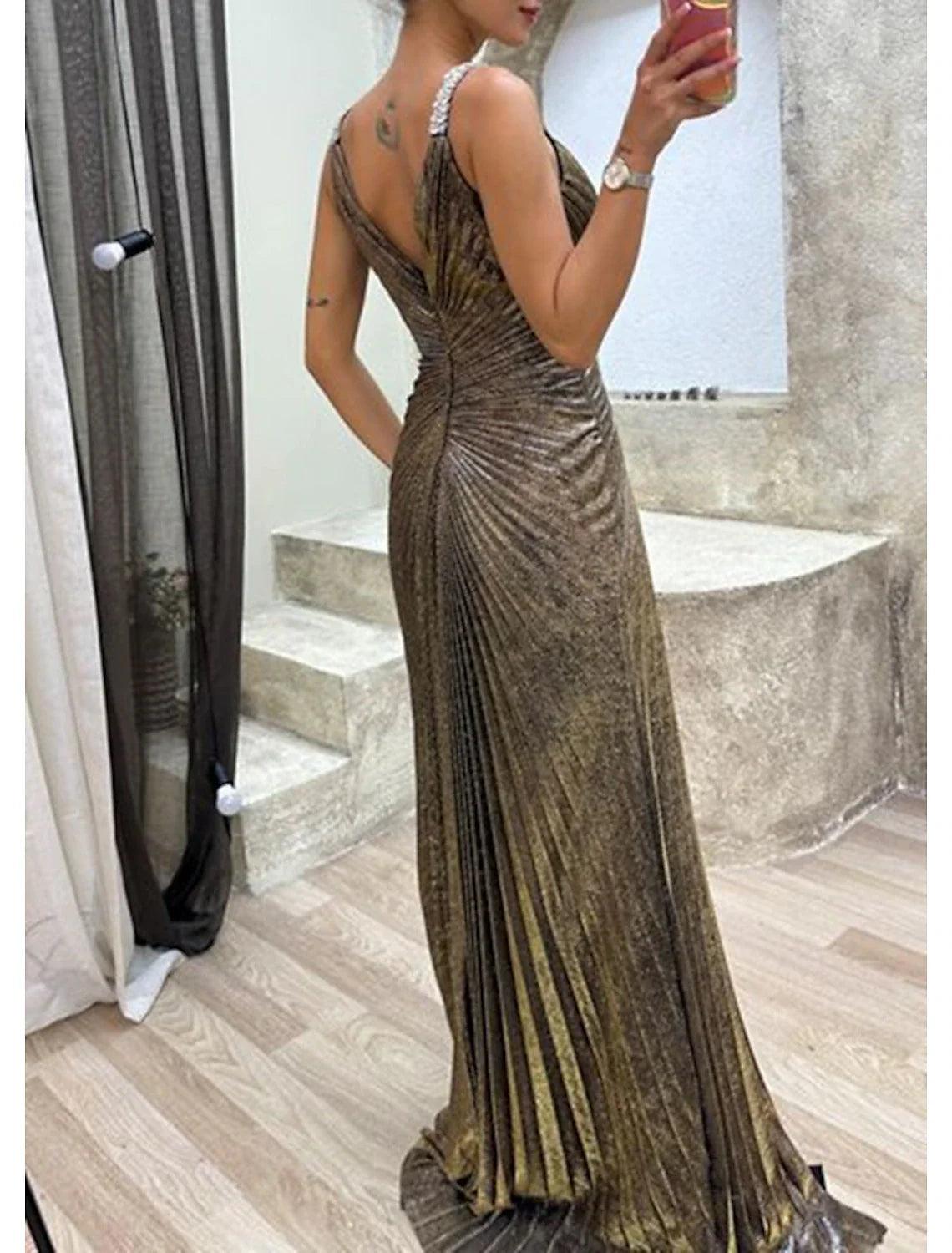 Vestidos de fiesta de sirena/trompeta, brillantes, formales, de noche, con cola larga/cepillo, sin mangas, escote en V, licra, con pliegues de diamantes de imitación y abertura.