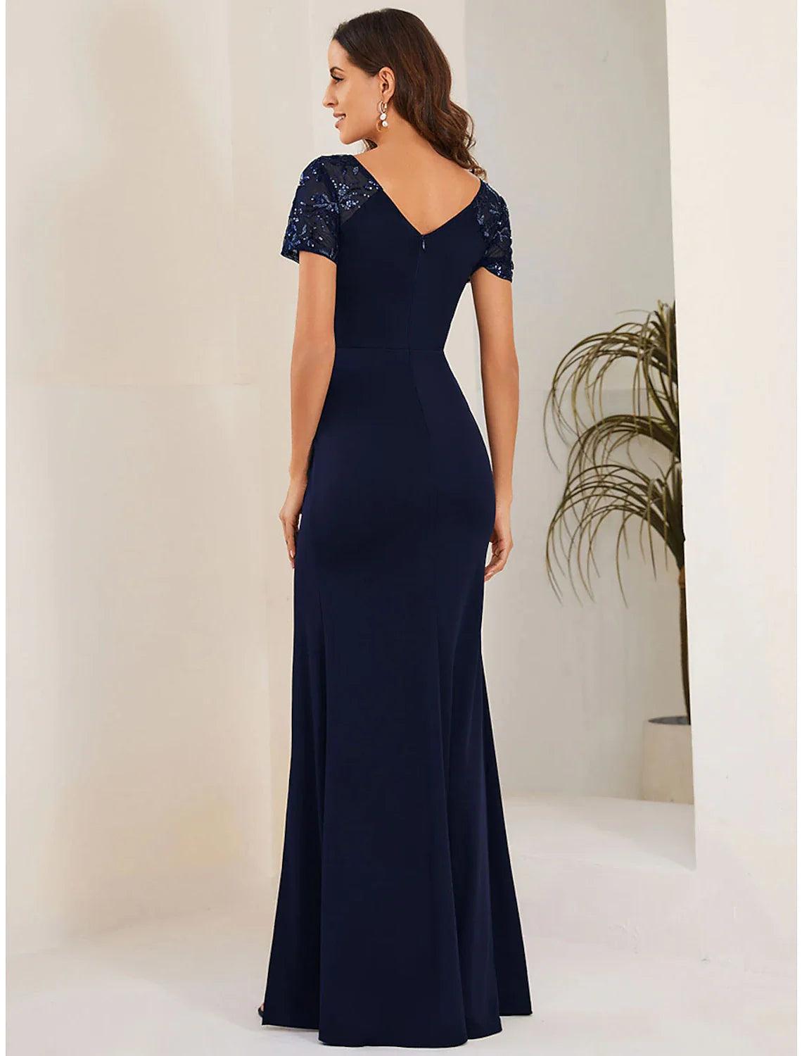 Vestidos de novia de sirena/trompeta para invitada de boda, vestido de abertura alta, formal, lazo negro, largo hasta el suelo, manga corta, cuello en V, tela elástica con abertura de cristales