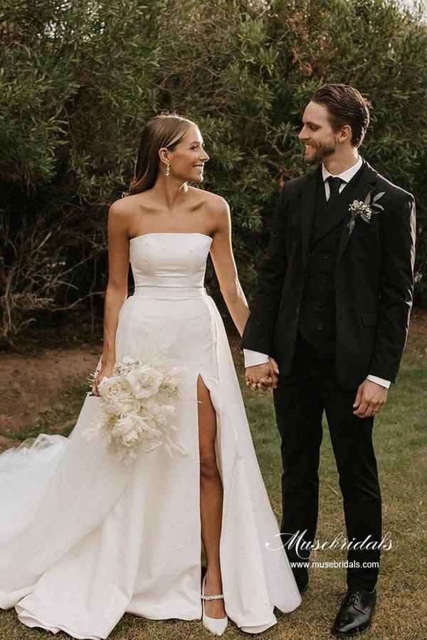 Vestido de novia sencillo de satén con cuentas, sin tirantes y abertura lateral. MW928