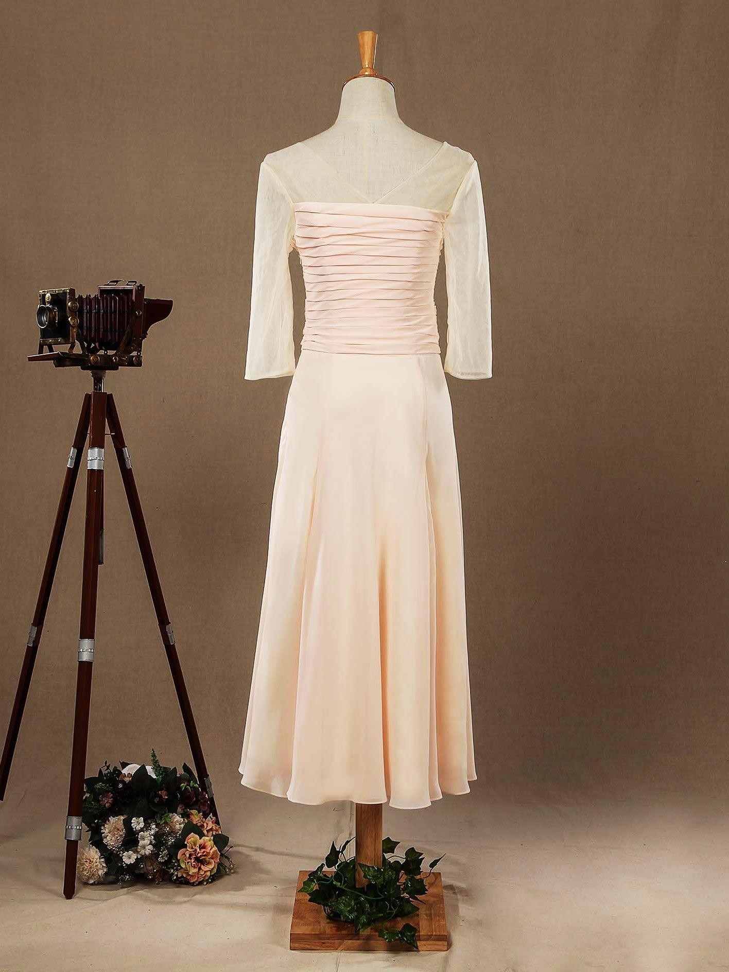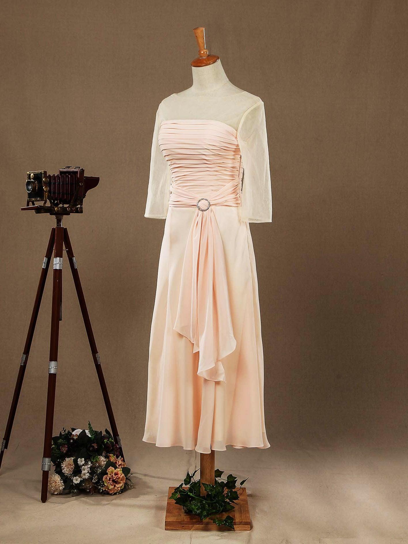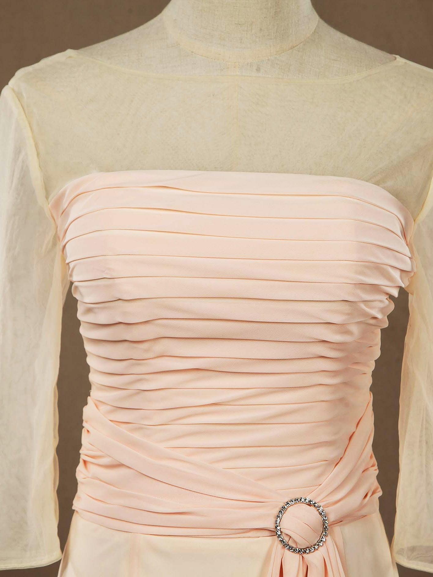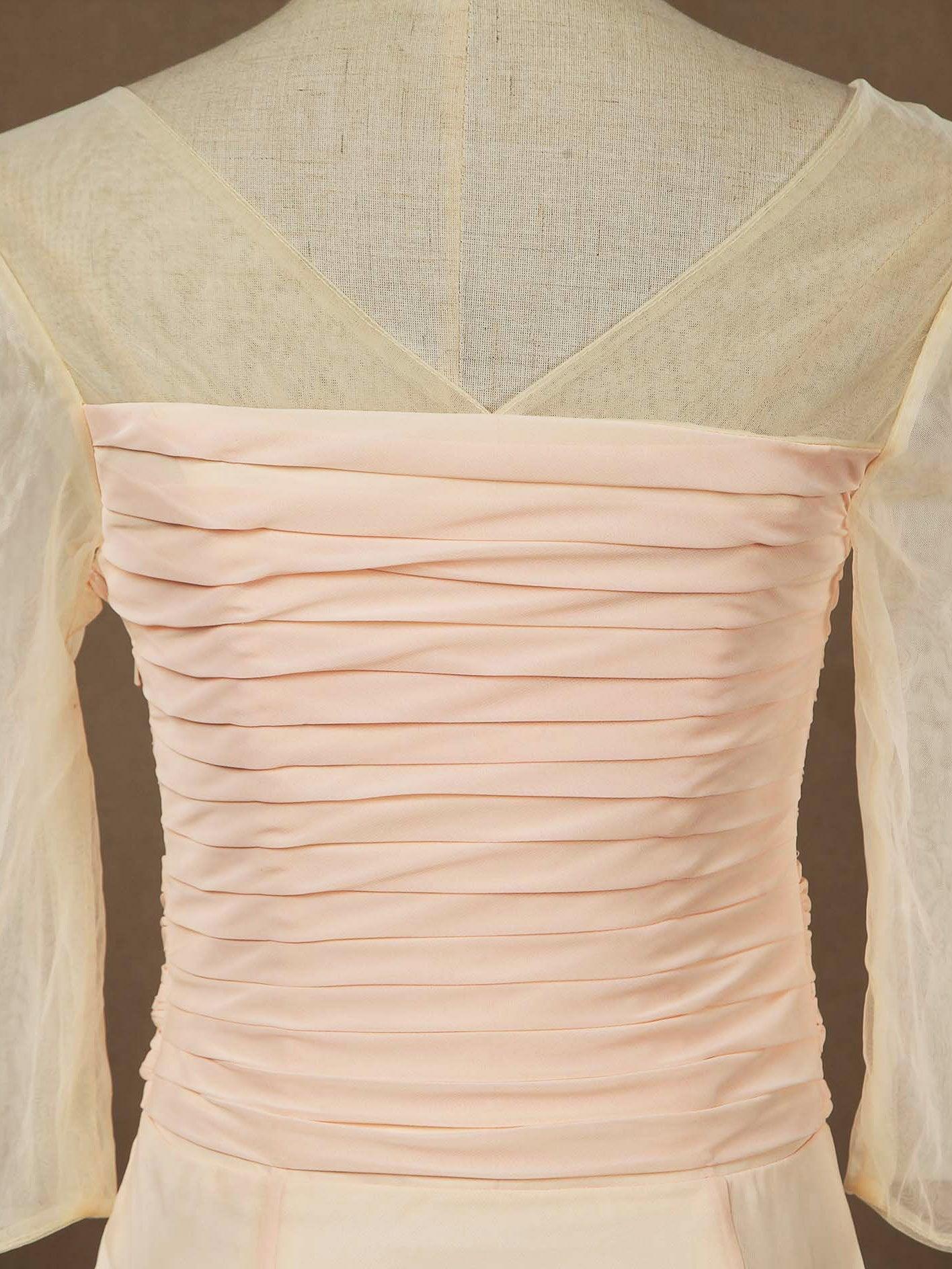 Vestido de dama de honor de gasa con corte tubo/columna, largo hasta la rodilla, con mangas largas transparentes, hecho a pedido.