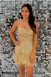 Experimenta el glamour definitivo con nuestro vestido dorado de fiesta con tirantes finos y borlas. Este brillante vestido, también disponible en azul, luce delicados tirantes finos y llamativos detalles de borlas. Sé el centro de atención con este bonito y moderno vestido, perfecto para cualquier evento de fiesta.
