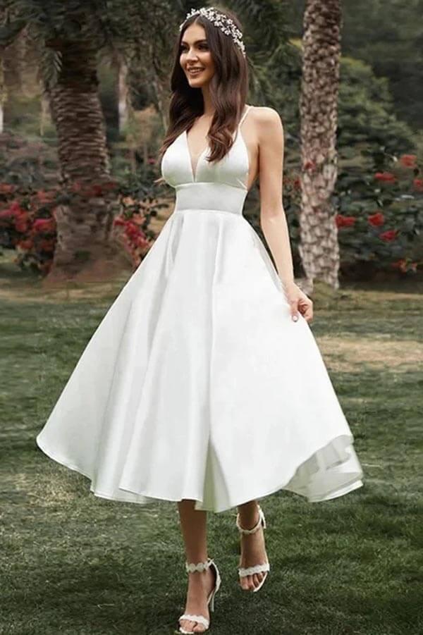 Vestido de novia sencillo de corte A con tirantes finos y largo hasta la rodilla. MW916