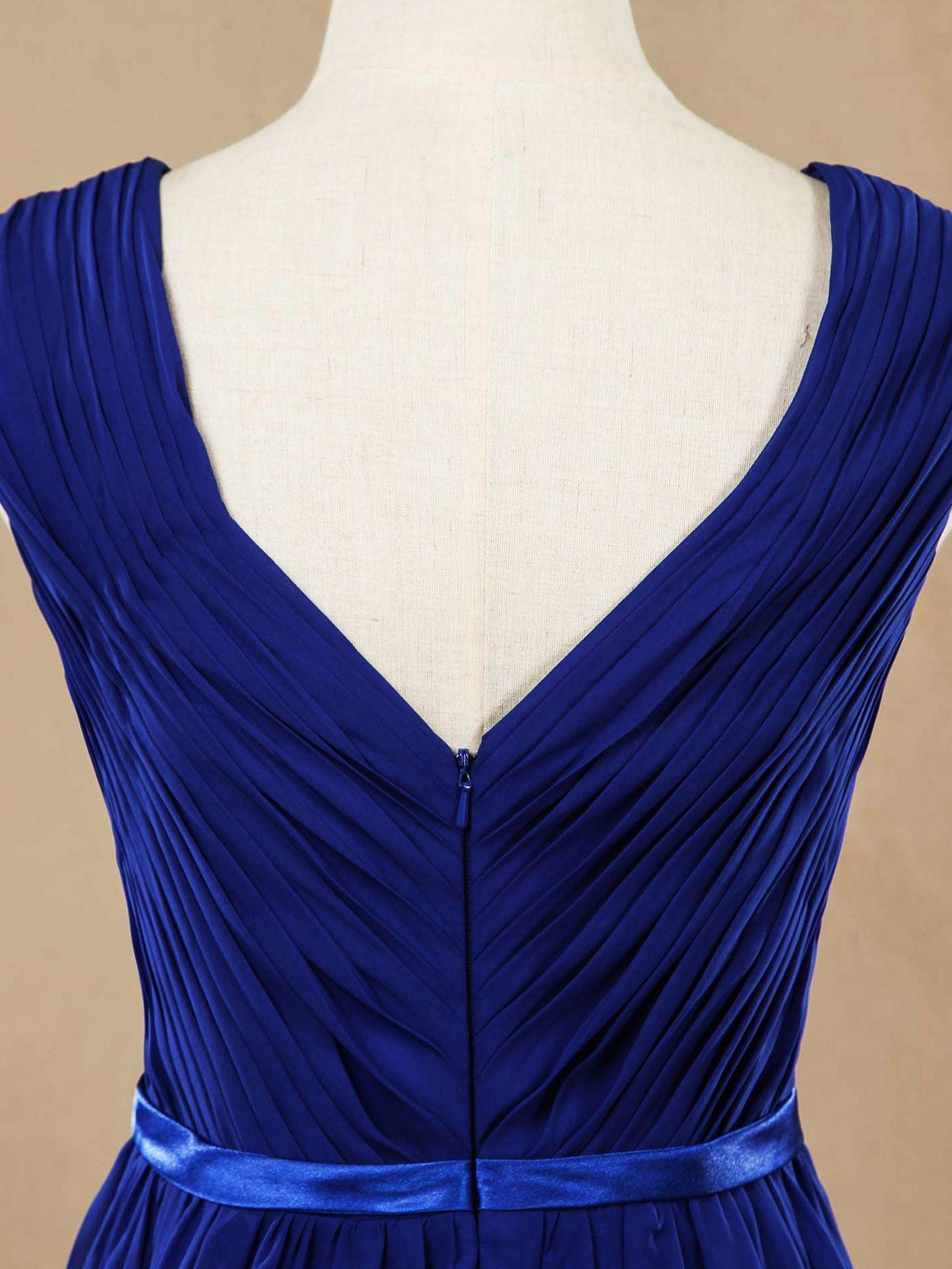 Vestido de dama de honor de gasa con escote en V, corte A y largo hasta la rodilla, con fajín y pliegues fruncidos. Hecho a pedido.