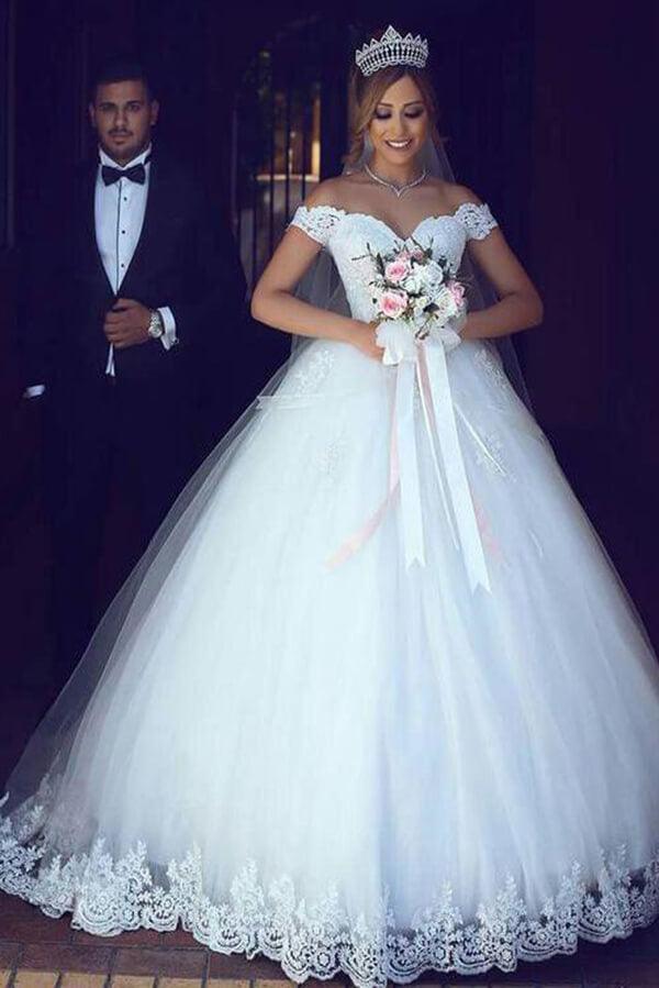Vestido de novia de tul con hombros descubiertos, apliques y cola larga. MW566